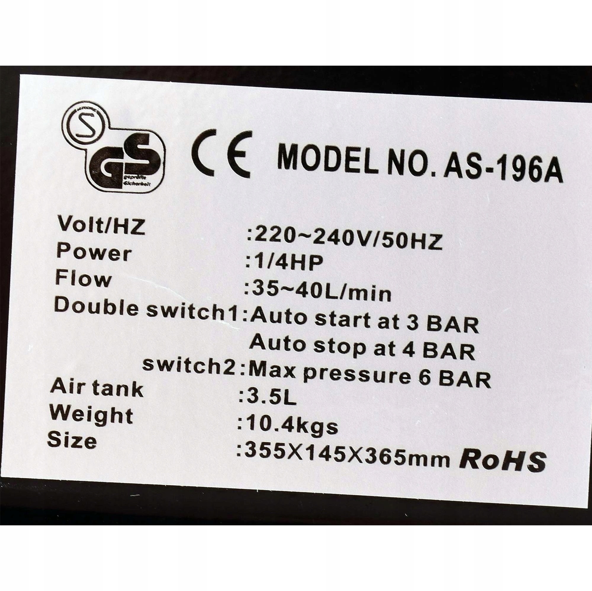- Двойной Переключатель: Переключатель 1: Автоматическая остановка, запуск при 3 бар, остановка при 4 бар. Переключатель 2: Макс. давление 6 БАР. Предохранительный клапан: автоматически сбросьте давление воздуха. когда давление в воздушном резервуаре превышает 6 БАР.