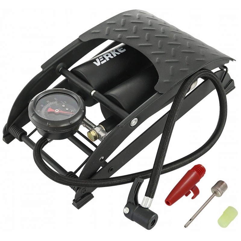 Двухпоршневой ножной насос VERKE. Насос прочной конструкции, изготовлен из тисненого лакированного стального листа толщиной 3 мм. Легко читаемый манометр, показывающий бар (0–7) и фунты на квадратный дюйм (0–100). Прочный и гибкий шланг длиной 550 мм. В комплекте два адаптера. Идеально подходит для профессиональных услуг и домашнего хозяйства.