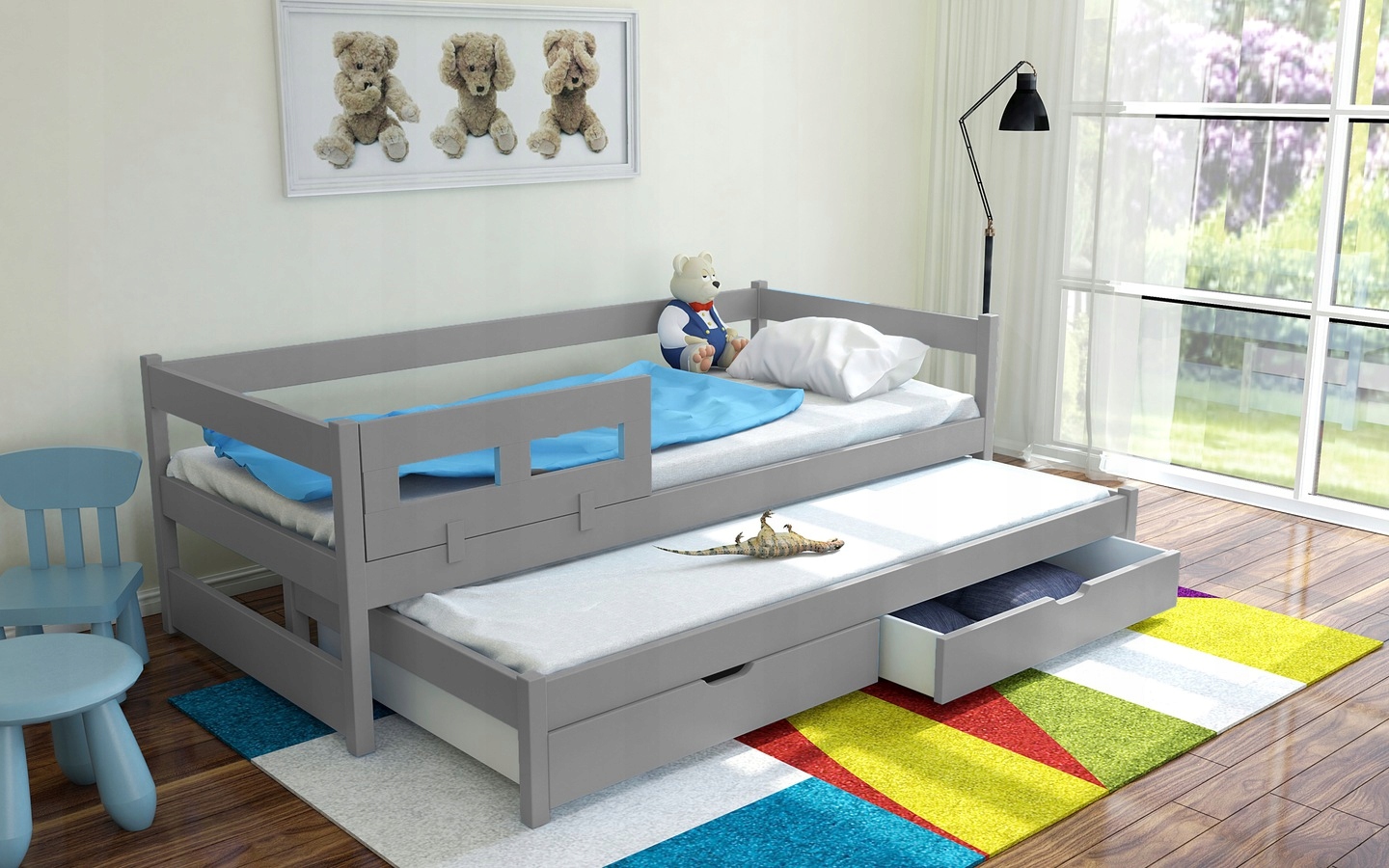 Кровать изготовлена из древесины сосны, центры и Фасады ящиков изготовлены из плиты МДФ. Окрашен экологическими красками на водной основе.