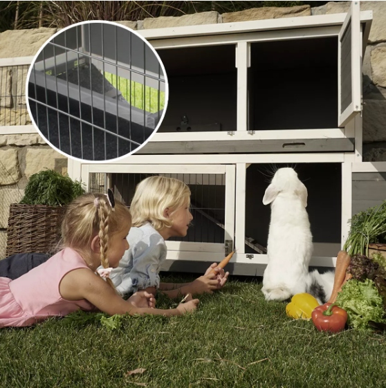Провод из защищенной окрашенной стали тщательно интегрирован в высококачественную древесную клетку для кроликов MH-20. Благодаря этому кролик имеет достаточную свободу передвижения, но в то же время обеспечивает защиту и безопасность от хищников. Благодаря щели между проводами в двухсторонней клетке для кроликов, дети всегда могут увидеть своего питомца.