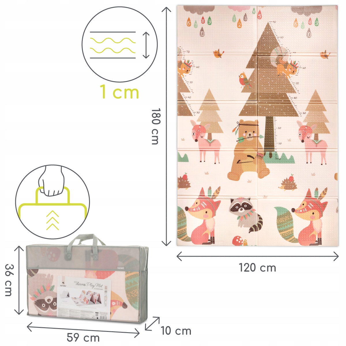 Практичный и красочный игровой коврик – незаменимый элемент каждой детской комнаты. Благодаря теплоизоляции он защищает малыша от холода и в то же время создает безопасное, мягкое и гигиеничное место для игр, ползания и обучения ходьбе. Складная конструкция и сумка для переноски позволяют легко брать его с собой в дорогу или хранить, когда он не используется.