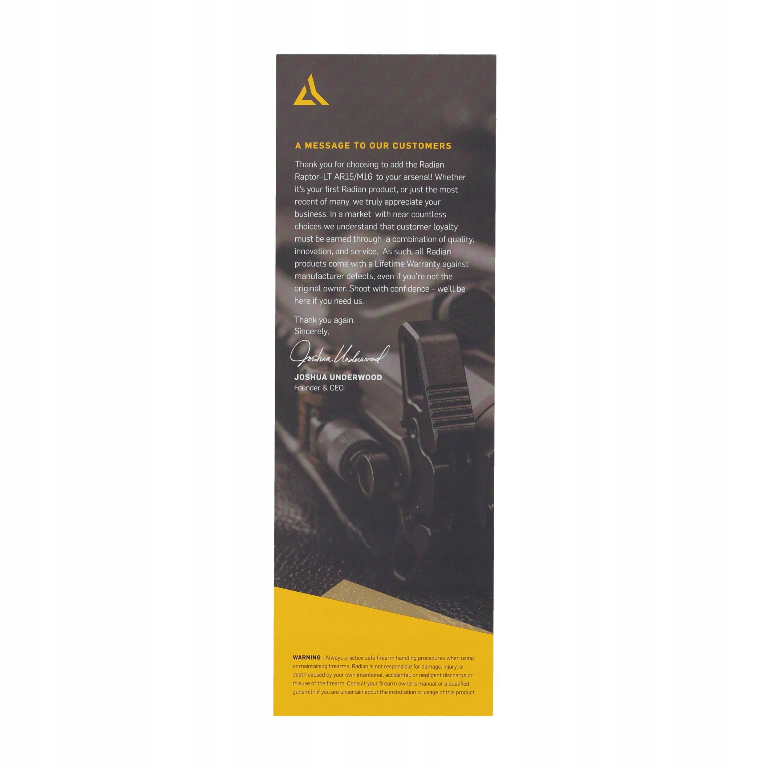 рычаг перезагрузки AR-15 Raptor-LT был разработан с учетом наибольшего комфорта и эффективности использования для платформ AR15/M16. Созданный американской компанией Radian Weams, Light и чрезвычайно прочный дизайн , рычаг обеспечивает точную, быстрое перегрузку как правых, так и левых стрелков, что делает его идеальным выбором для динамических расстрелов, например IPSC