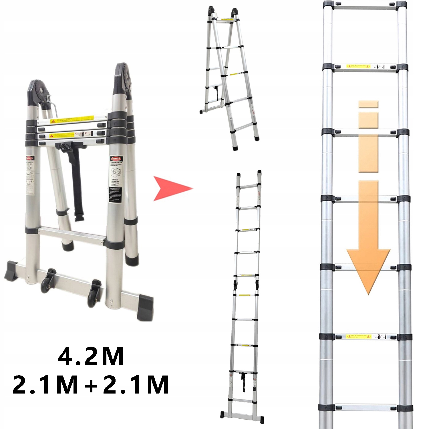 Алюминиевую лестницу 2 в 1 можно использовать как лестницу типа А, прямую лестницу, телескопическую лестницу и лестницу. Лестница типа A имеет высоту 2,1M+2,1M, а прямая лестница имеет высоту до 4,2M, что идеально подходит для использования внутри и снаружи помещений.