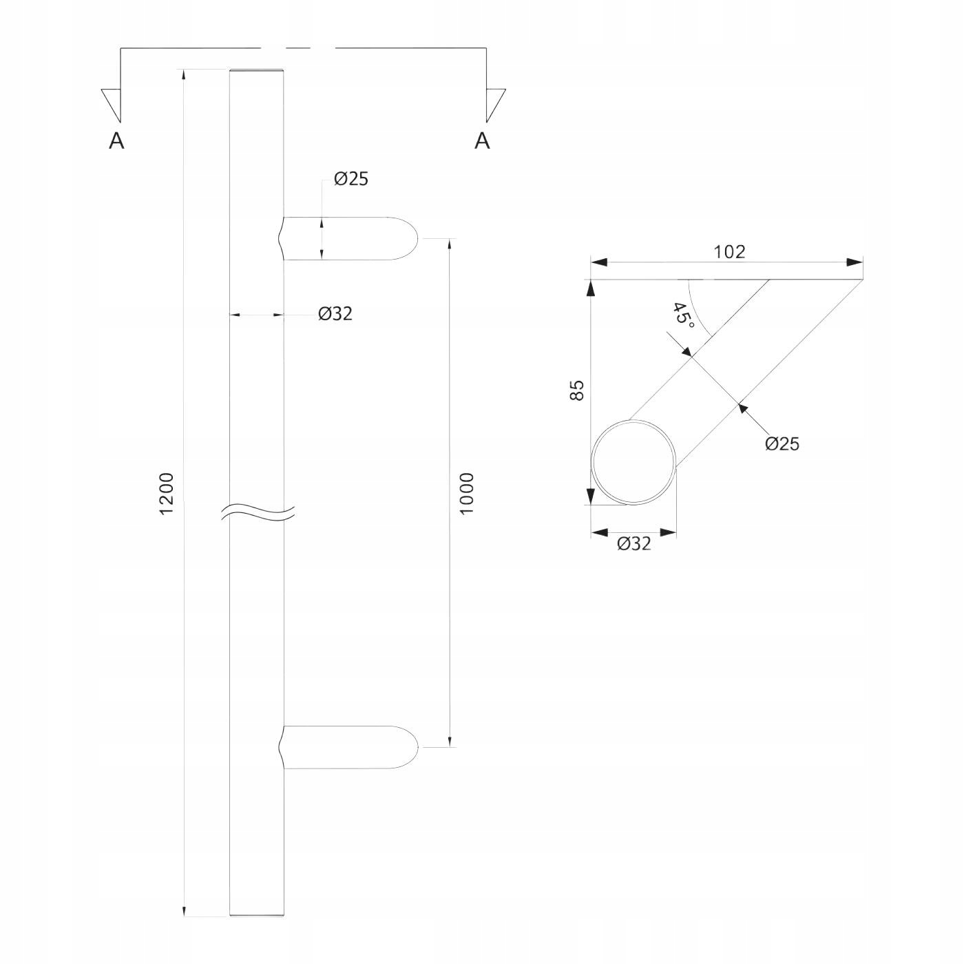 Ручка двусторонняя круглая 45°, 32х1200мм aisi304 универсальный сатин
