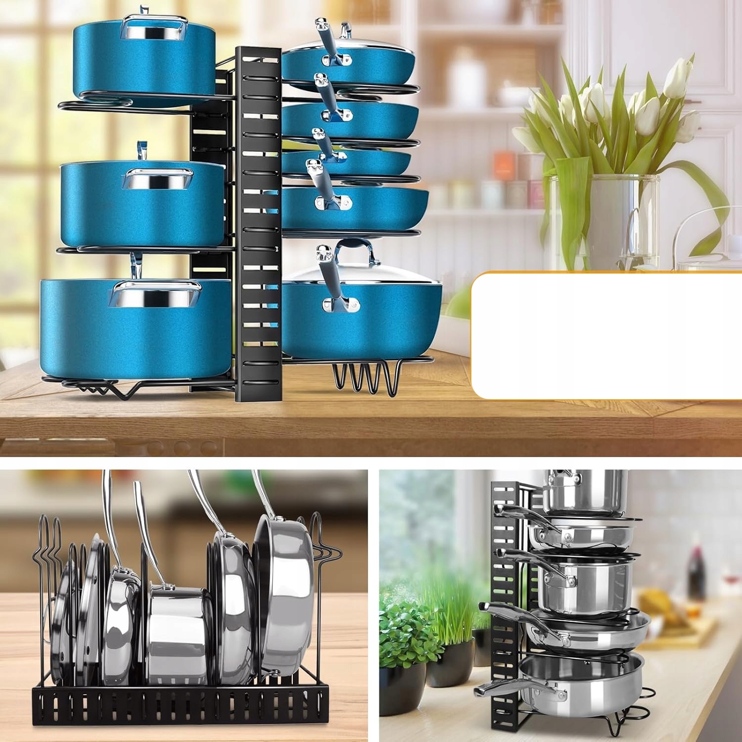 - 8-уровневая ручка для кухонной посуды: наша подставка для сковороды имеет 8 регулируемых уровней, вы можете установить подставку для хранения горшков в соответствии с размером ваших горшков и кастрюли. Подходит для кухонной посуды, такой как крышки, кастрюли, сковороды, выпечки и рубки.
