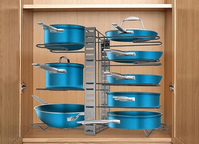 - 3 DIY Методы: этот организатор POT имеет 3 метода DIY, вы можете установить 8 уровней с обеих сторон или просто установить 4 уровня с одной стороны. Наш горшок для горшков можно размещать горизонтально, вертикально и с обеих сторон вертикально, что может сэкономить много места в шкафу.