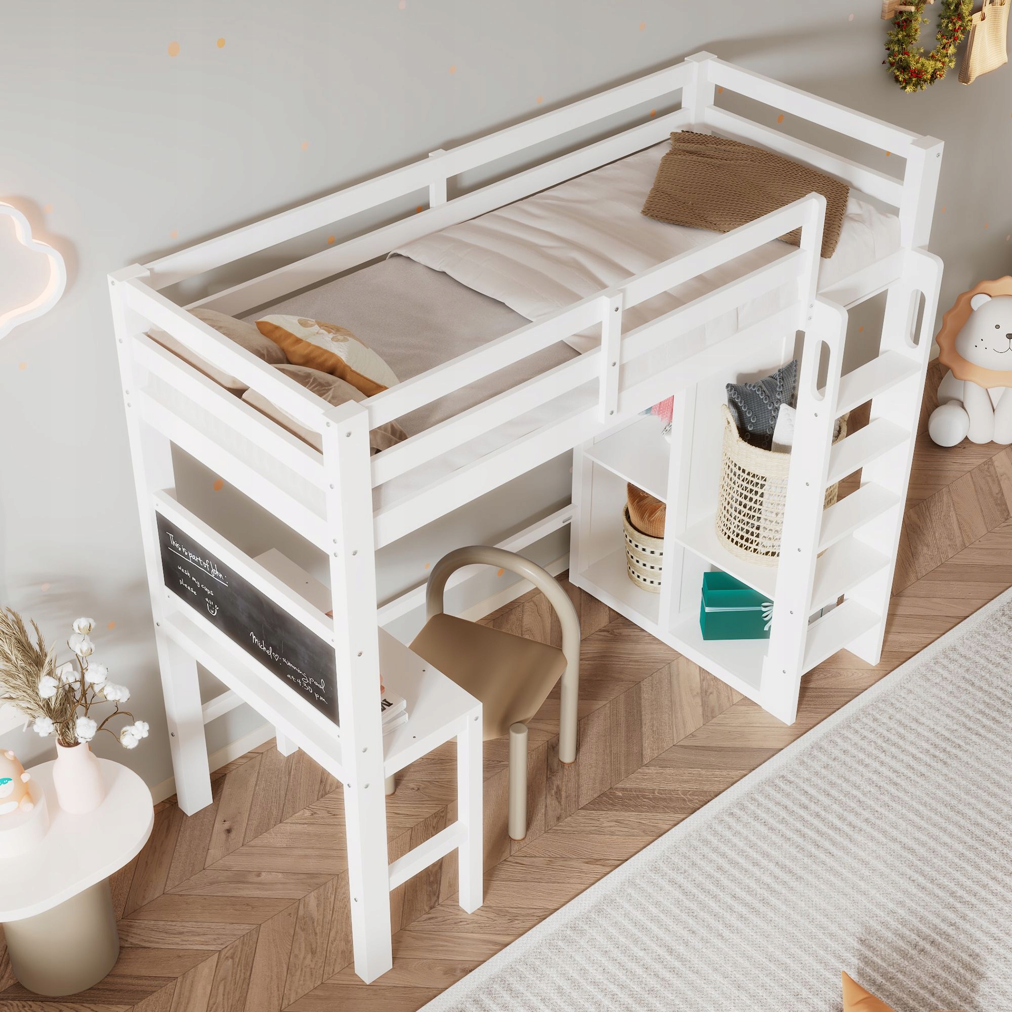 - Хранение и организация: открытый гардероб и полки помогают сохранить заказ в детской комнате и предлагать много места для хранения одежды, игрушек и книг, в то время как стол - это особое место для работы над домашними работами и творческими проектами. Он изготовлен из прочных материалов и оснащен барьеры и безопасной лестницей, которая облегчает доступ к верхнему уровню, благодаря тому, о котором родители не должны ни о чем беспокоиться.
