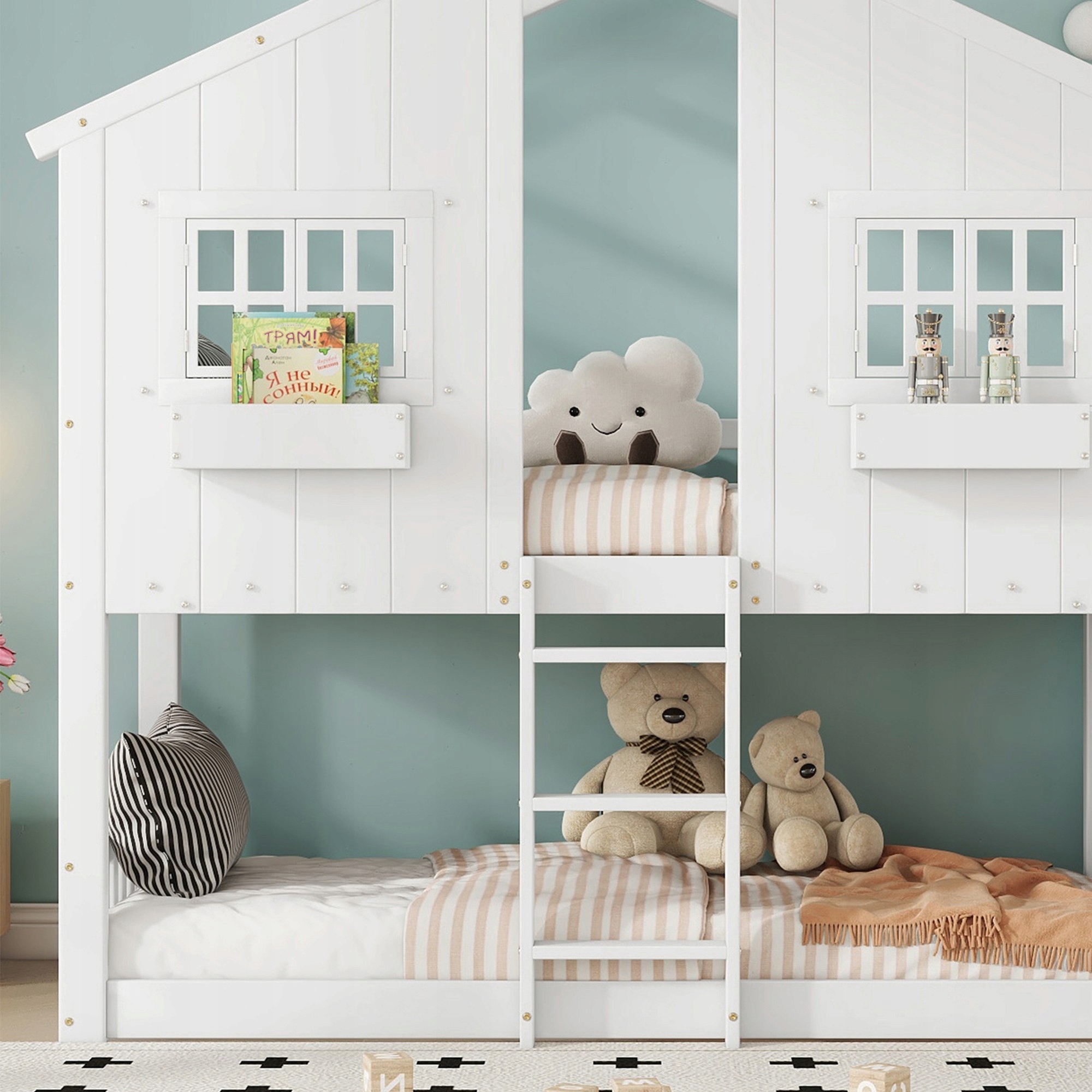 - Забавный дизайн: двухъярусная кровать с двумя большими окнами в качестве декоративного элемента. Это не только создает изобретательный вид, но и делает кровать особенно привлекательным элементом в детской комнате.