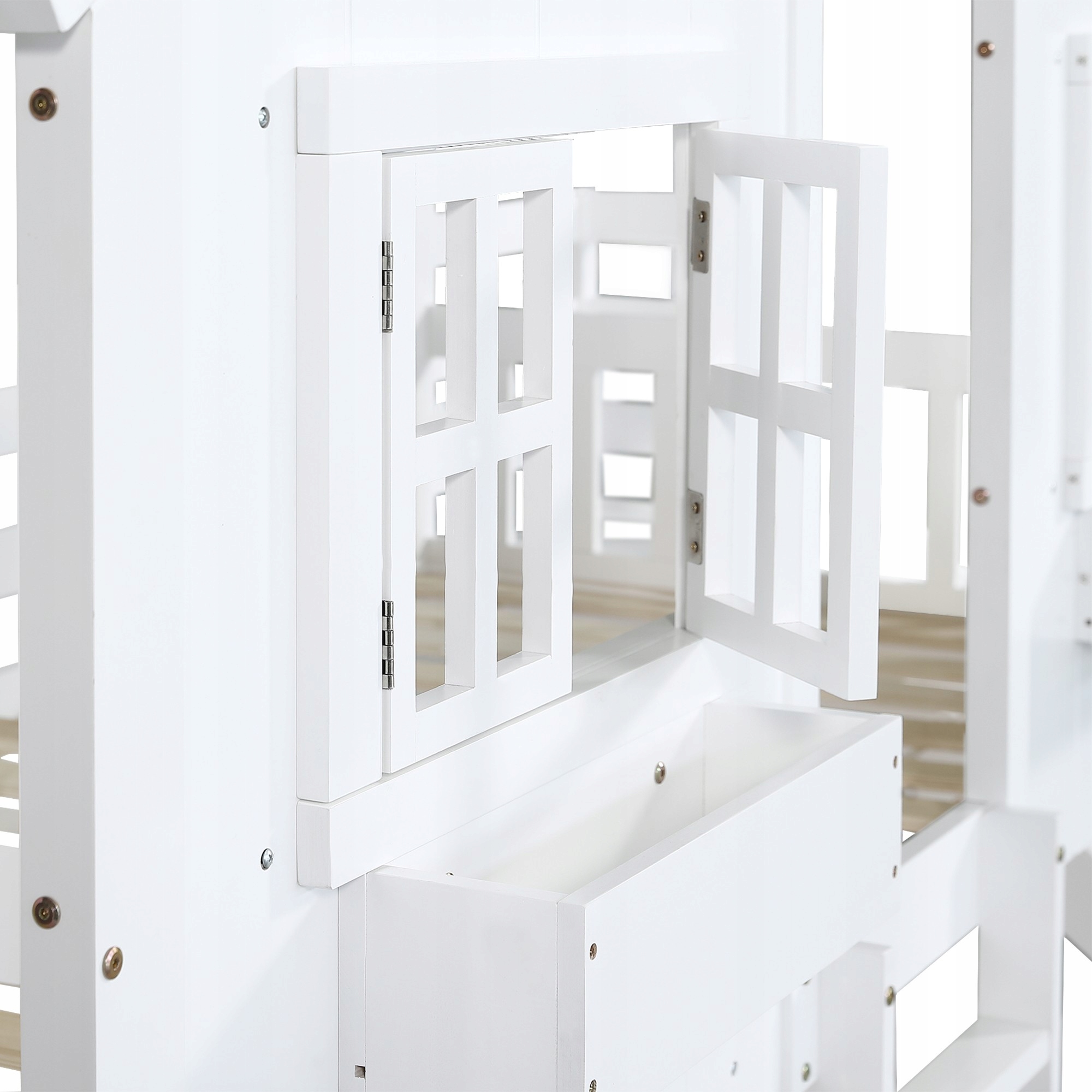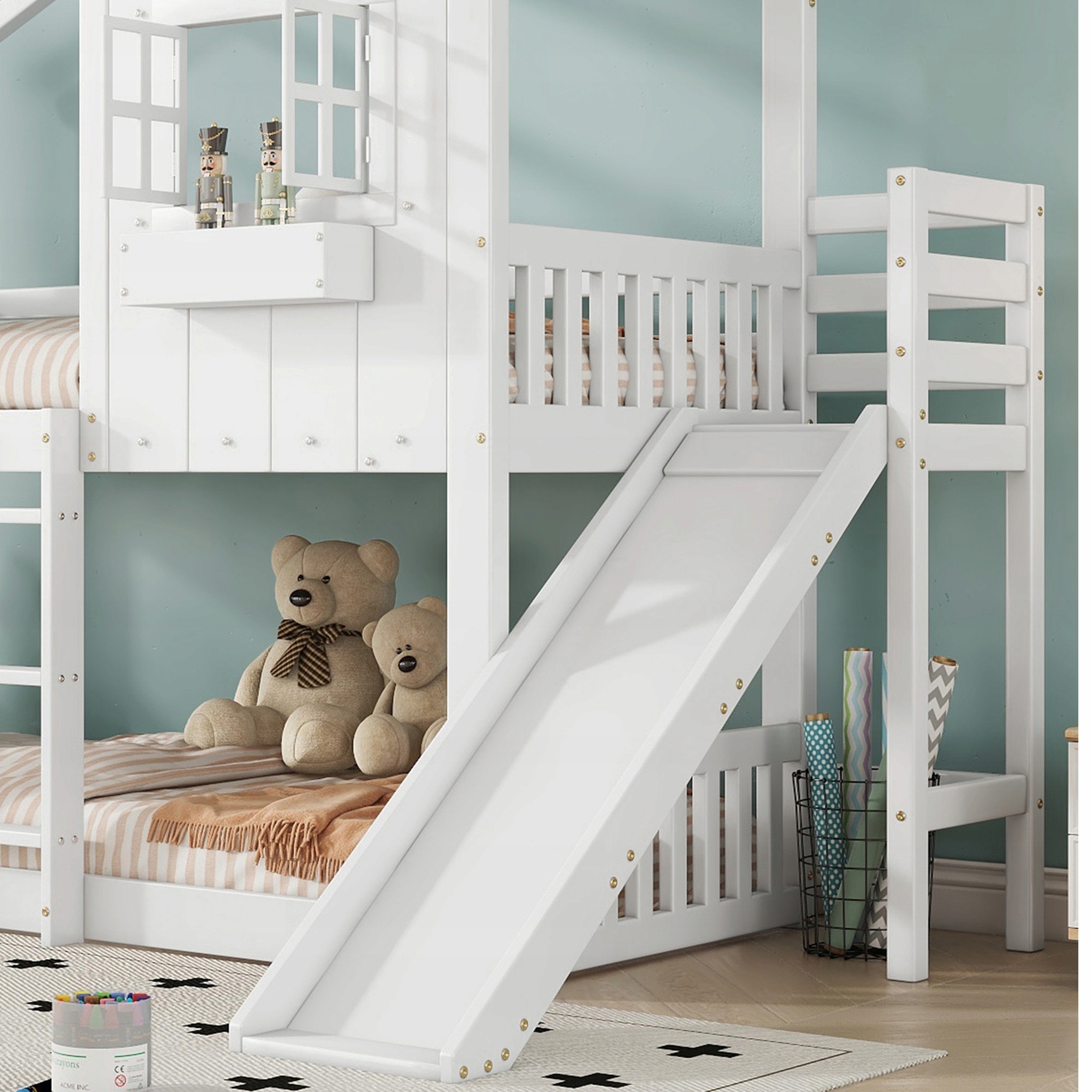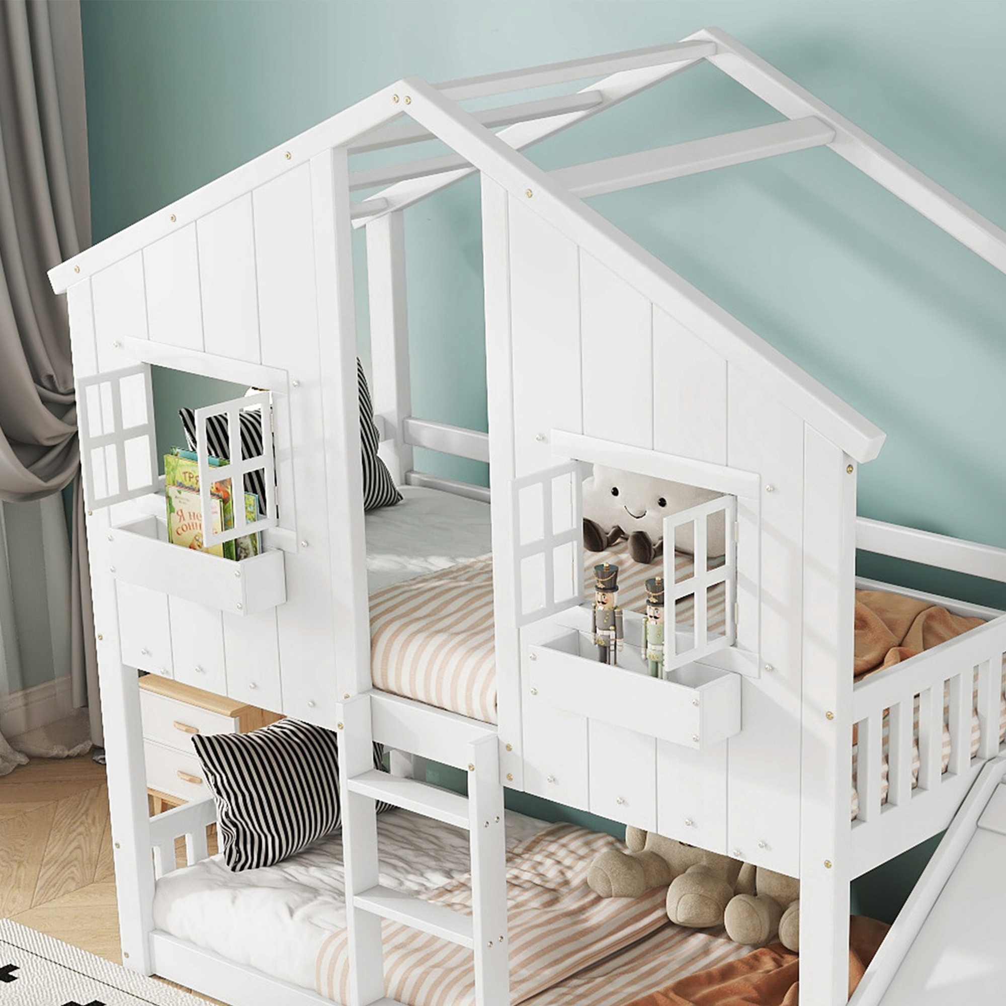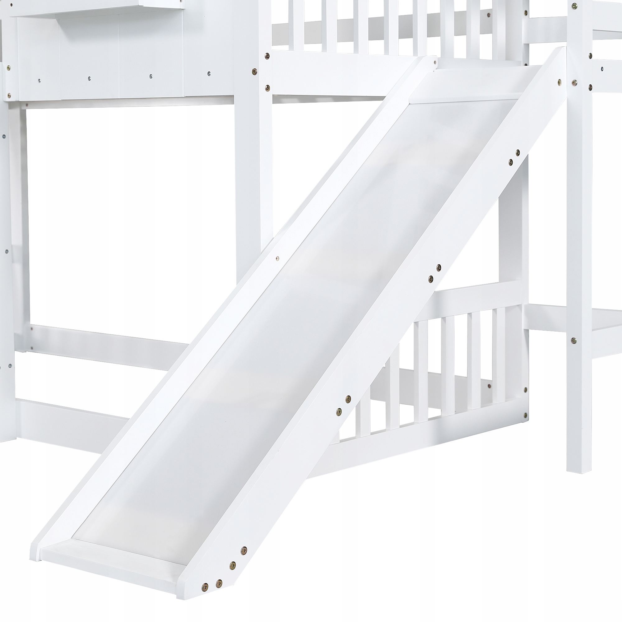 Bunk, детская кровать, со слайдом для детей, с крышей и окном, с защитными воротами, с трехэтажной лестницей, сосна + Mdf, белый, 90 x 200 см