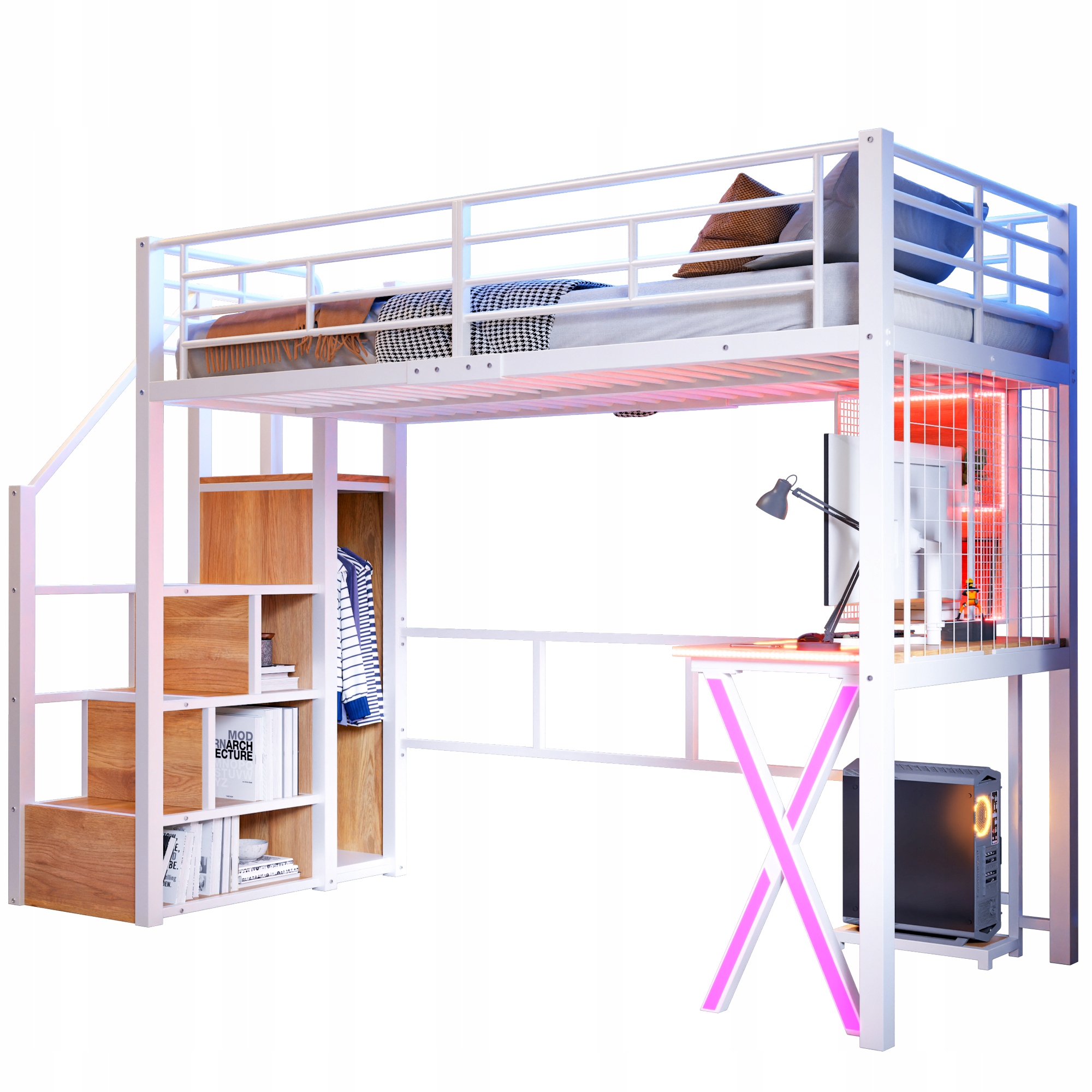 двухъярусная кровать, 90*200 см, дистанционное управление, лестница хранения, стол, гардероб, полки, без матраса, белый