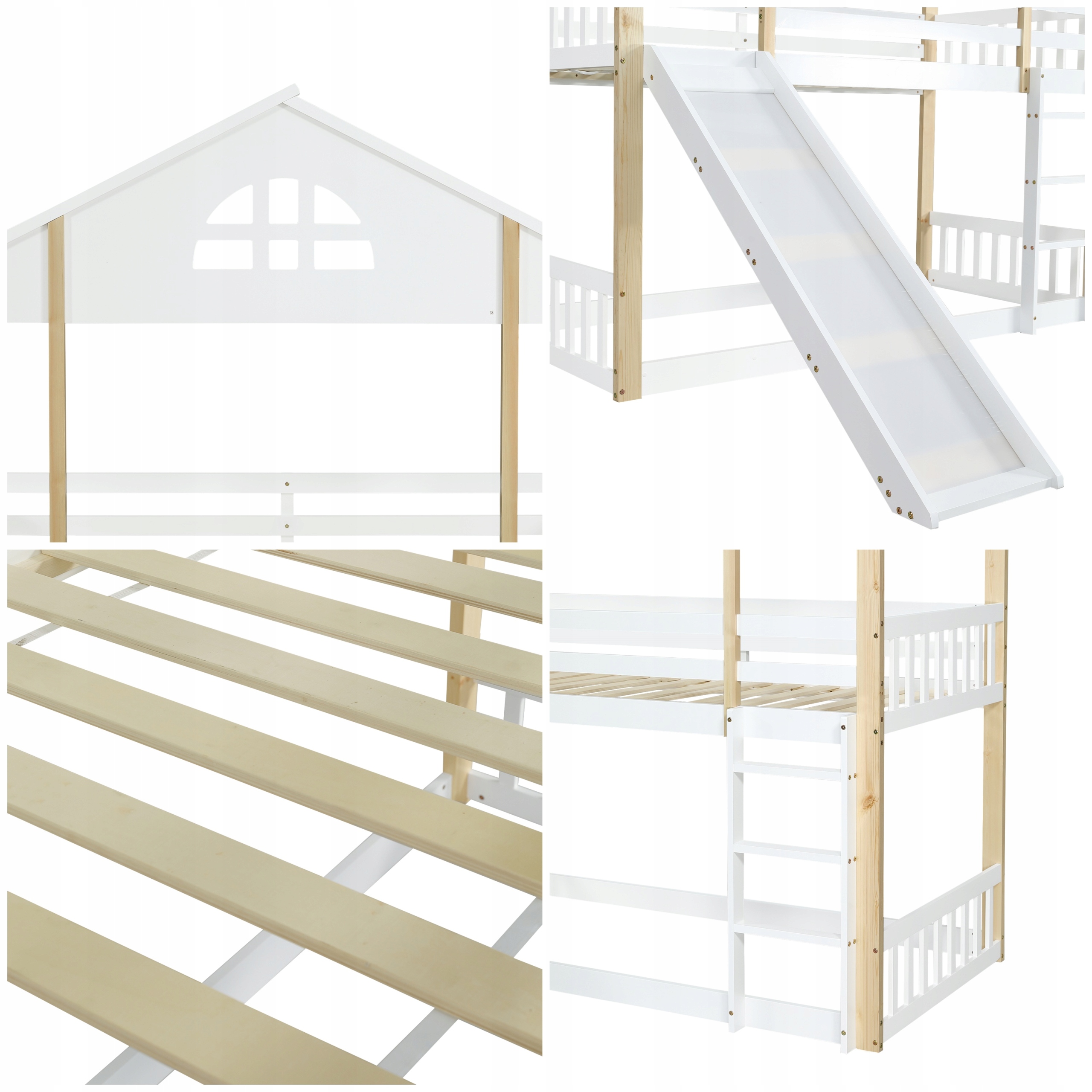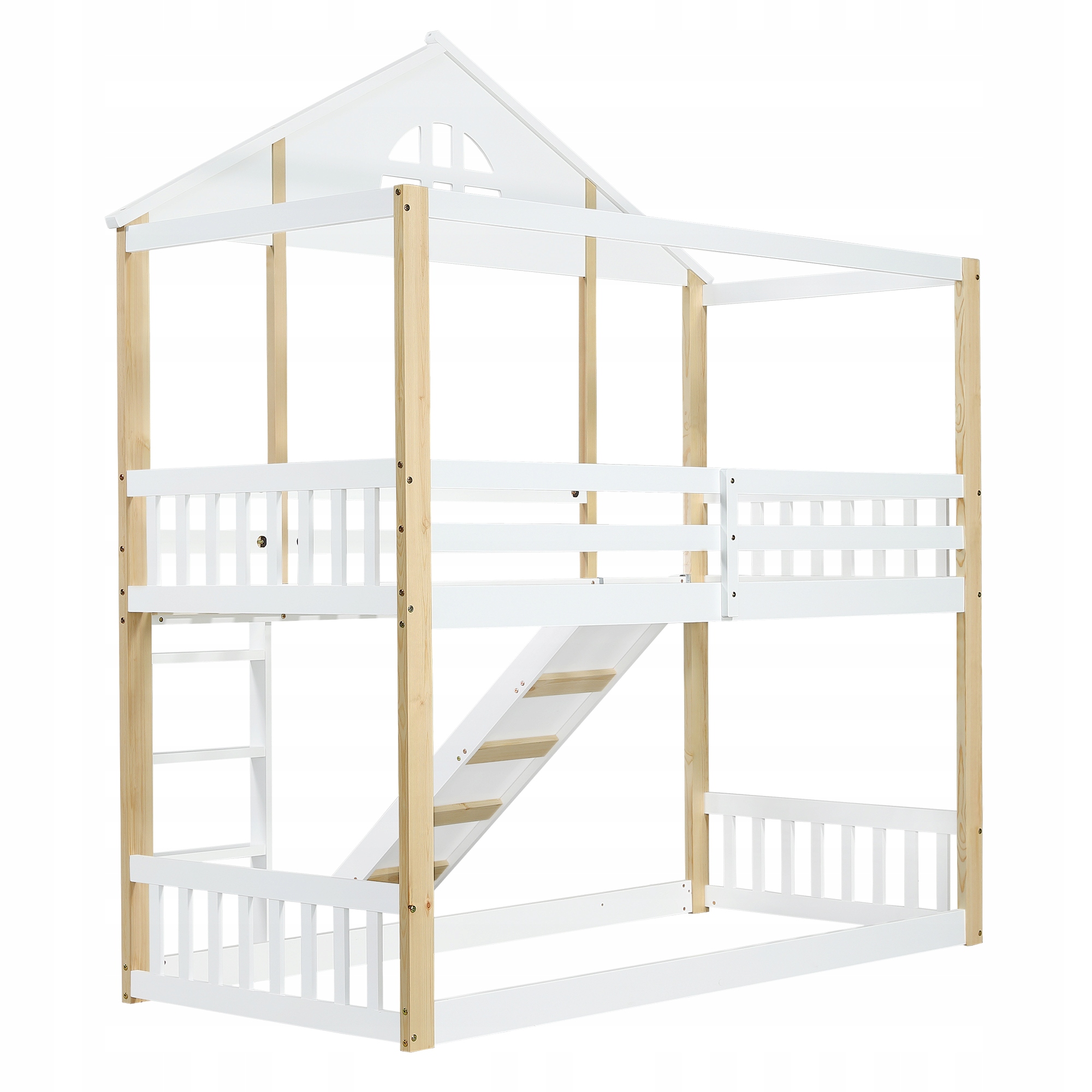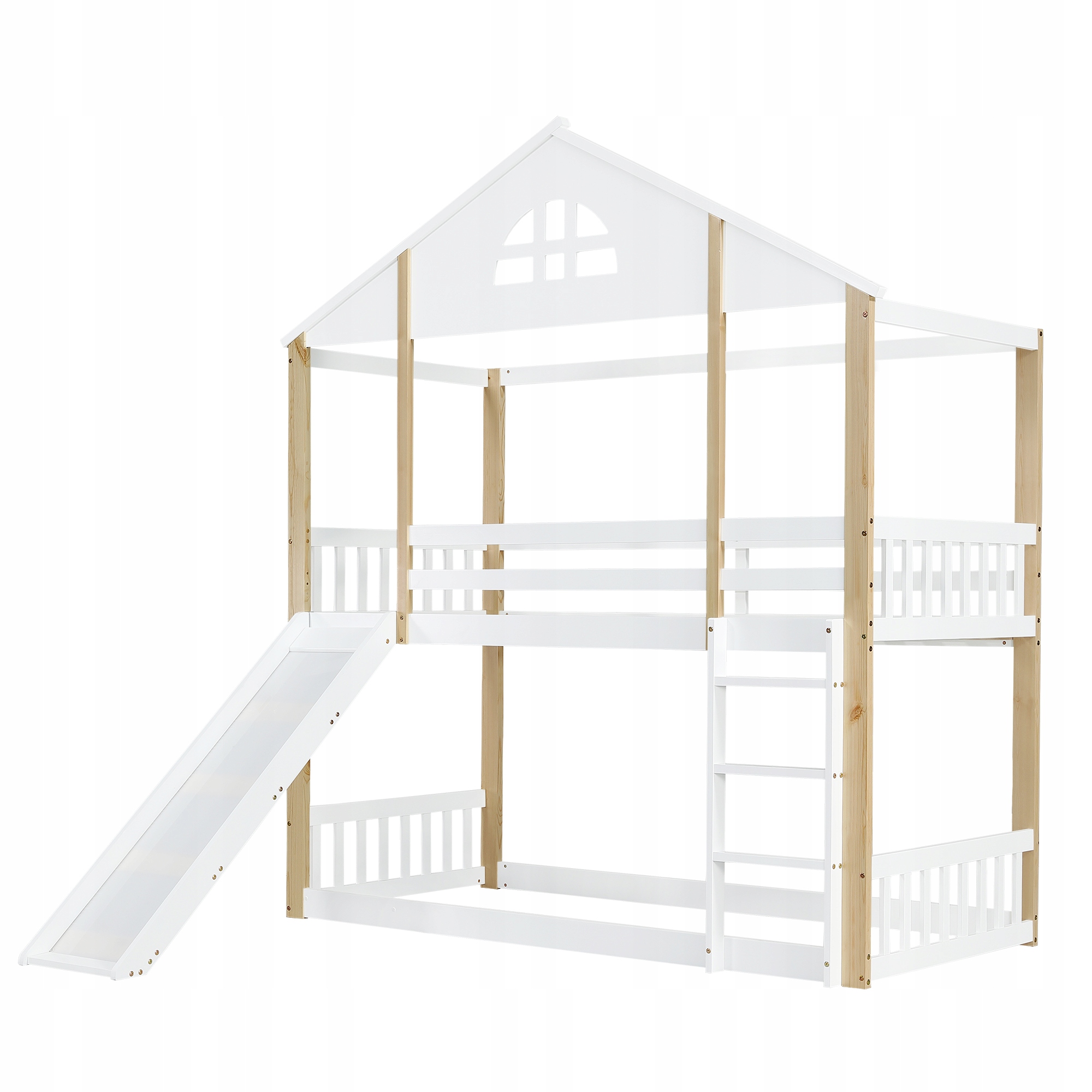 двухъярусная кровать с характерными окнами и трехэтажной угловой лестницей, детской кроватью со слайдом, кроватью дома с заборами и защитой от падения, сплошной деревянной кроватью, белой+натуральной, 90x200 см