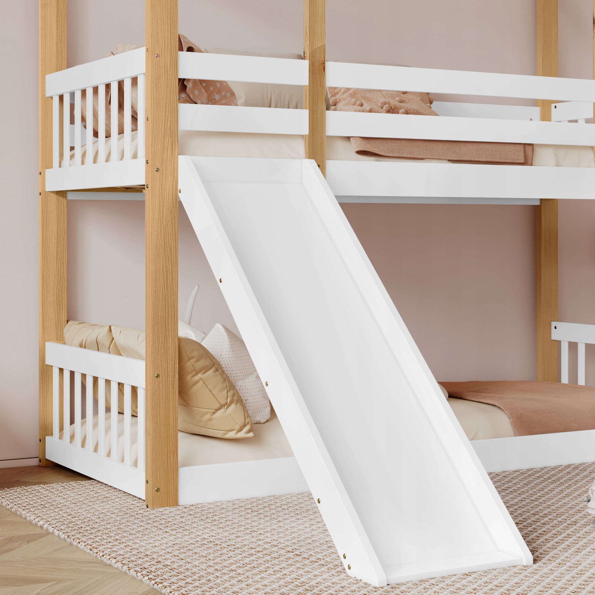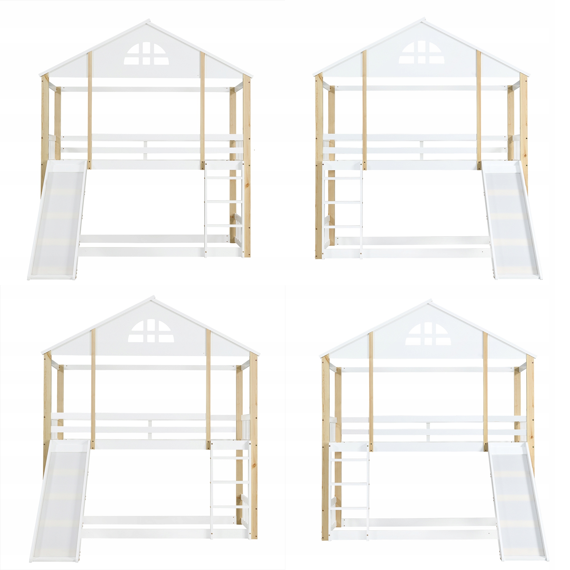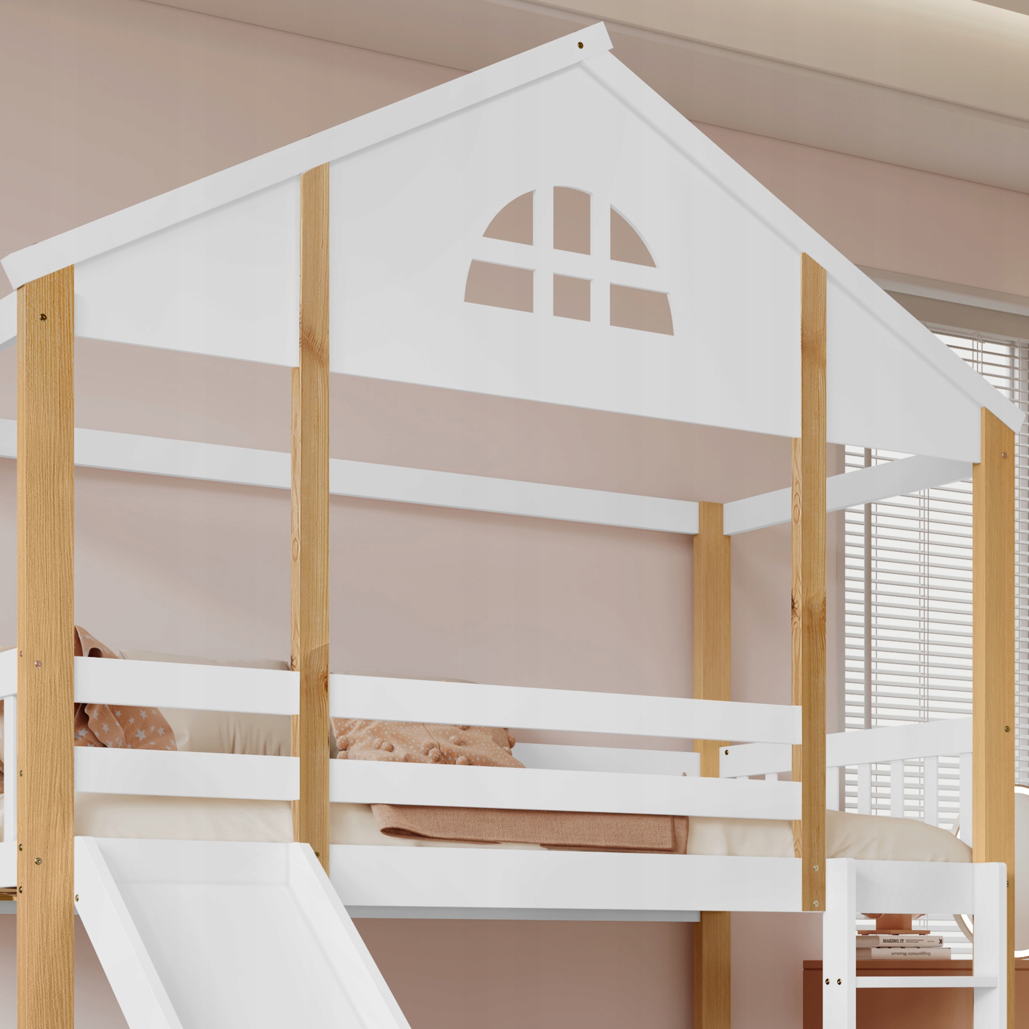 двухъярусная кровать с характерными окнами и трехэтажной угловой лестницей, детской кроватью со слайдом, кроватью дома с заборами и защитой от падения, сплошной деревянной кроватью, белой+натуральной, 90x200 см