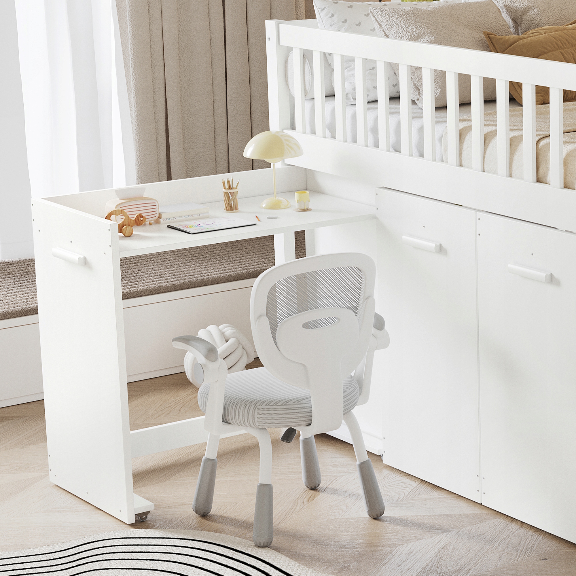 Много места для хранения: под кроватью есть 2 шкафа для одежды и 1 шкаф, которые предлагают гибкое пространство для хранения одежды, книг, игрушек и других личных вещей. Оснащен столом, который имеет функции сна, обучения и хранения.