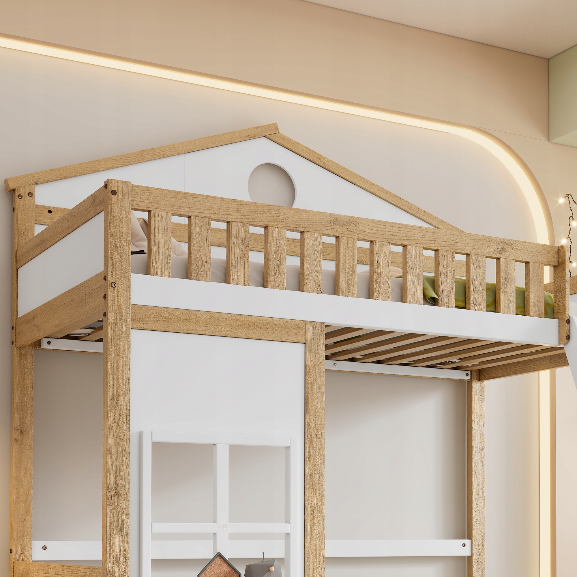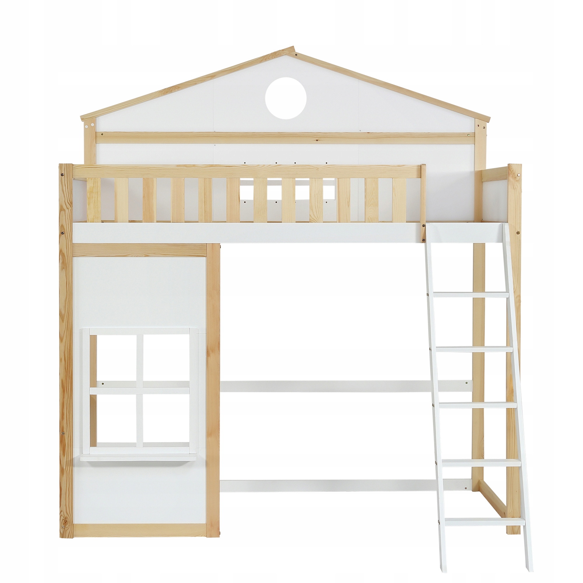 двухъярусная кровать, домашняя кровать, с лестницей, с защитой от падения и сетки, детской кровати с крышей и окном, под кроватью свободно спроектированной, сосновой рамки, сосны + Mdf, белый + натуральный, 90x200 см