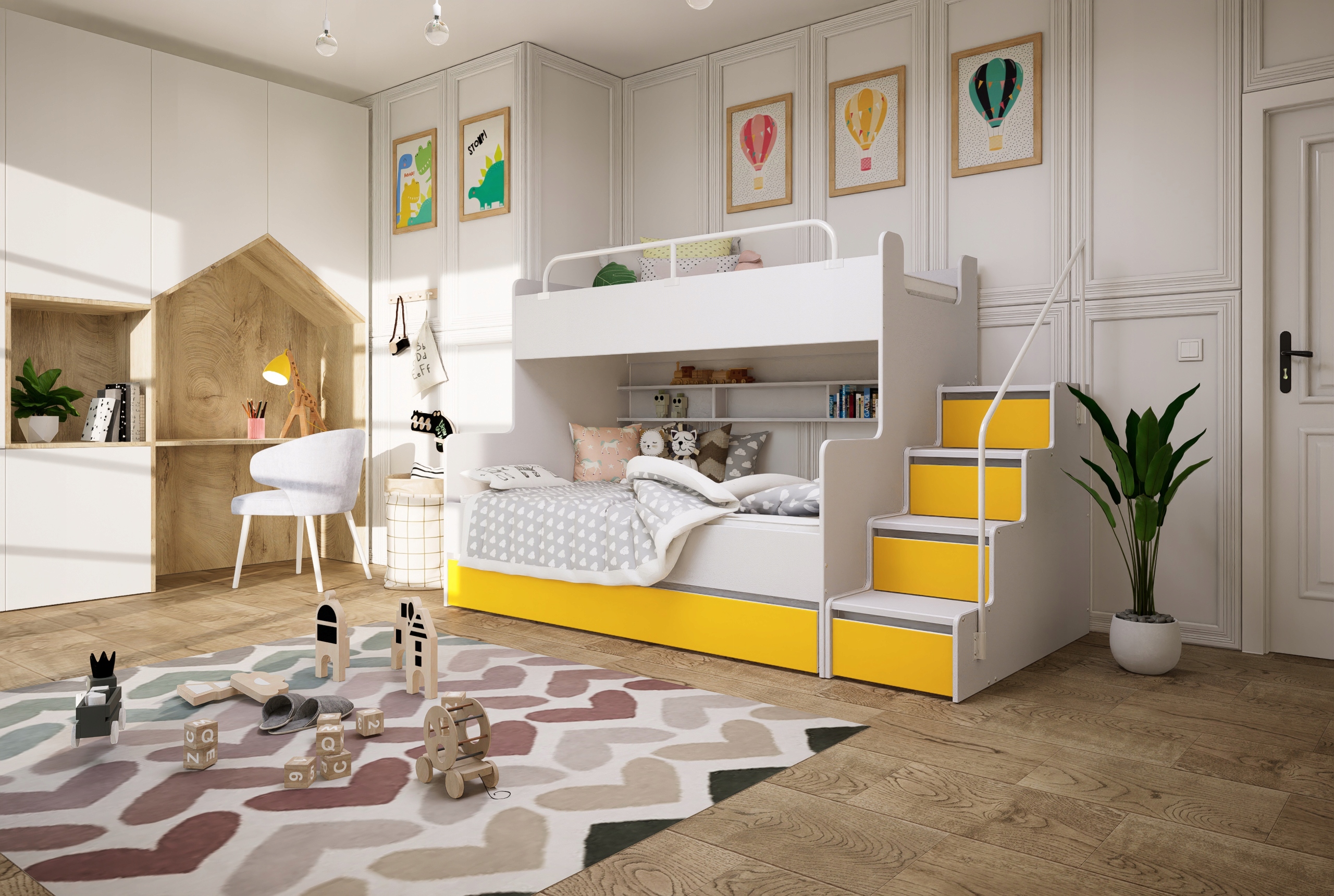 Модель кровати для детской или молодежной спальни. Мебель объединяет все важные функции, учитываемые при разработке детской комнаты, то есть