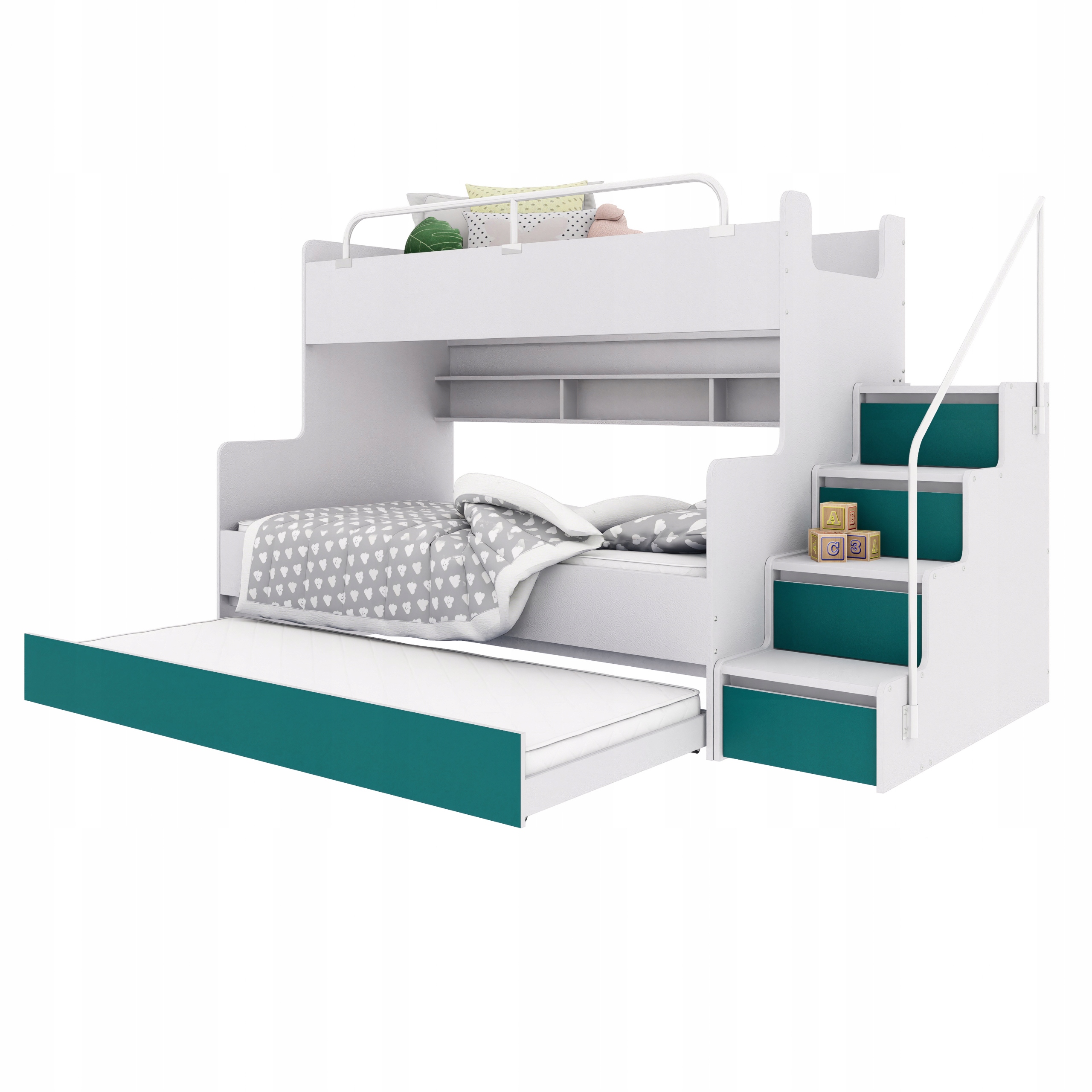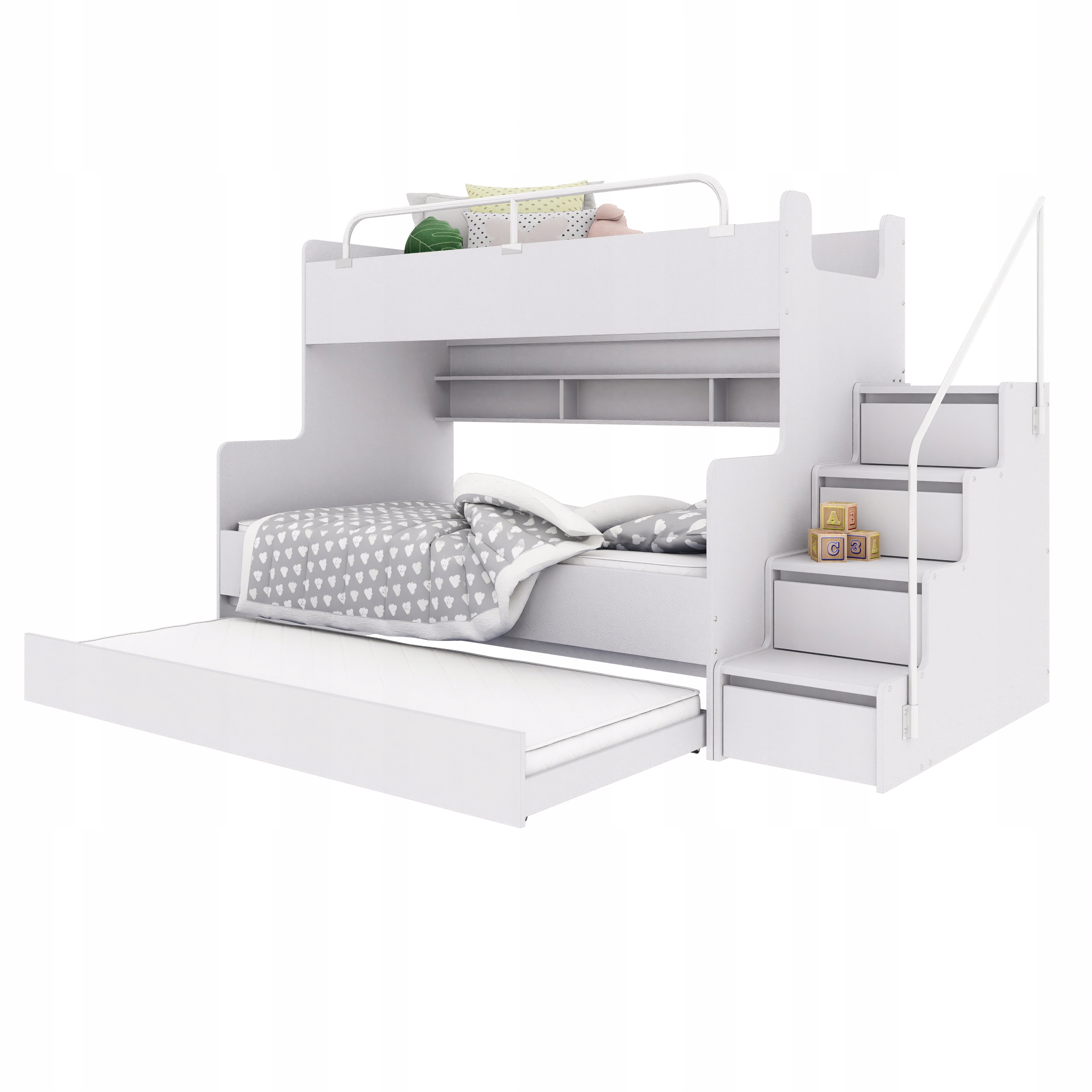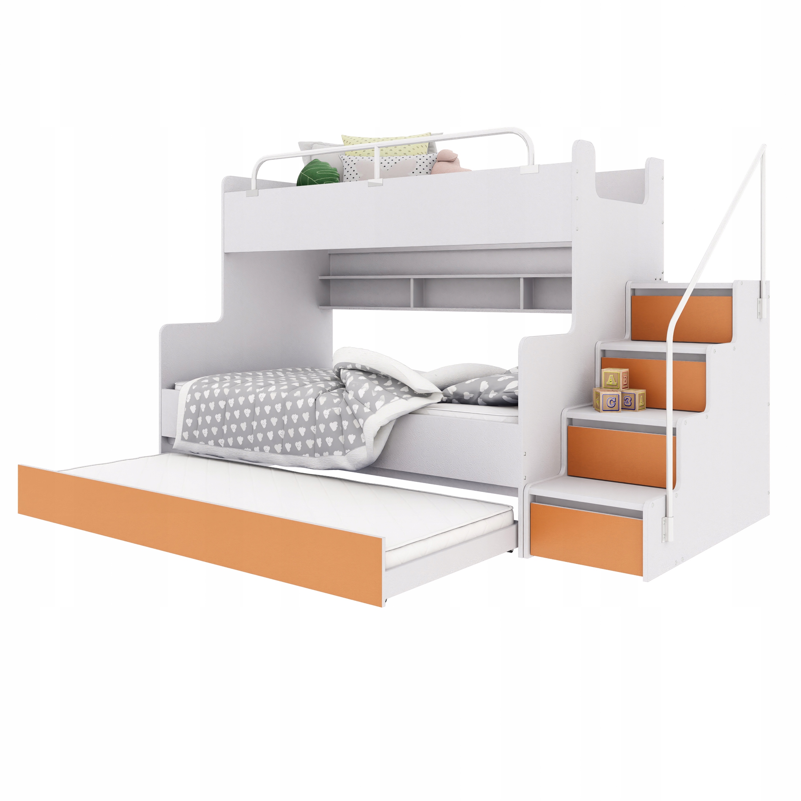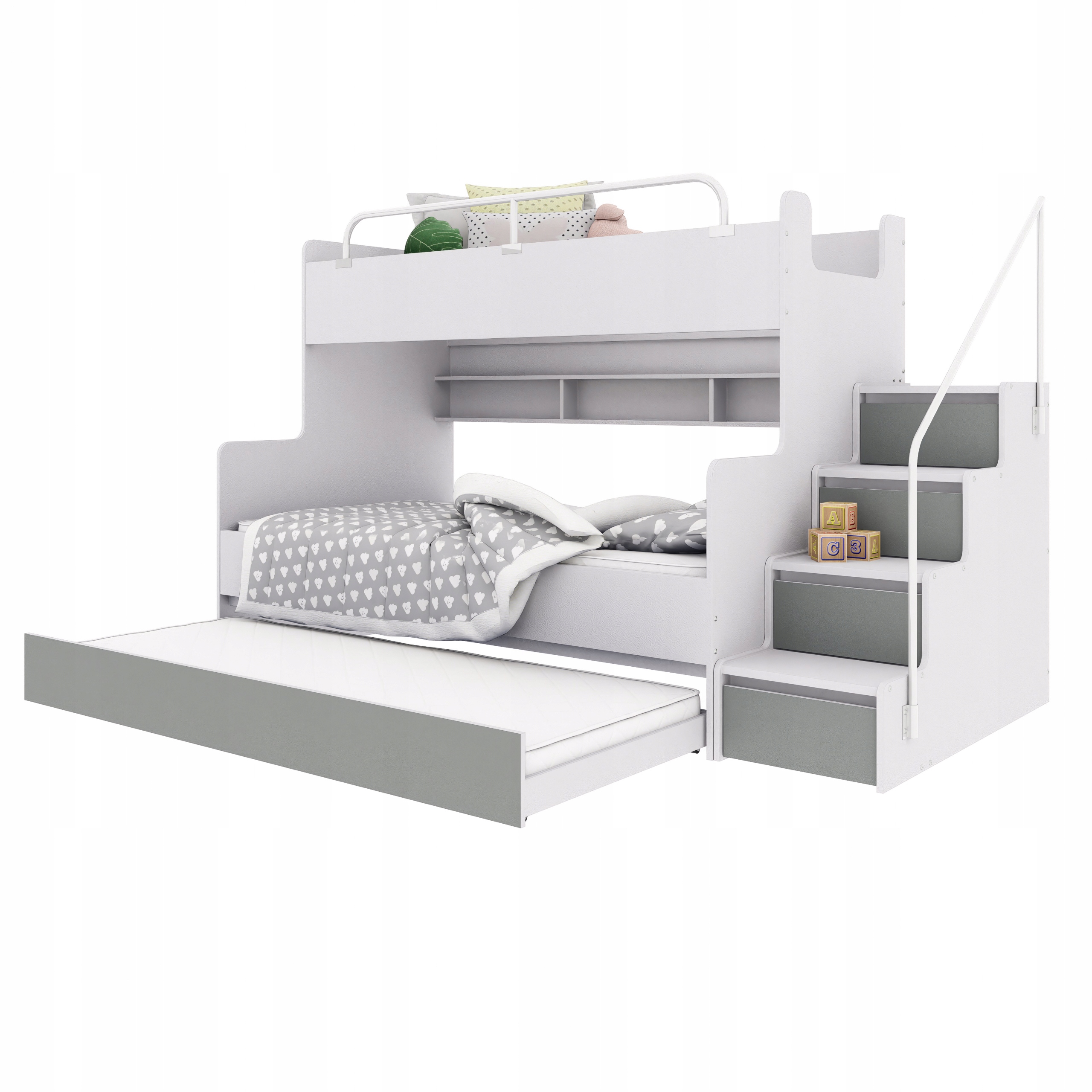 Двухъярусная кровать KIKI 3 с дополнительным спальным местом – универсальный и функциональный предмет мебели, идеально отвечающий потребностям современной детской или подростковой спальни. Разработанный с учетом повседневного комфорта и эстетики, он сочетает в себе удобное спальное место и практичные решения для хранения вещей. Прочная конструкция обеспечивает безопасность, а возможность выбора стороны лестницы позволяет легко вписать кровать в любой интерьер. Встроенные полки возле нижней кровати позволяют разместить книги, игрушки и другие мелкие предметы, которые, возможно, захотите иметь под рукой. Дополнительным преимуществом является просторный выдвижной ящик, идеально подходящий в качестве третьего спального места или места для хранения постельного белья и детских аксессуаров. Благодаря этому КИКИ 3 не только экономит пространство, но и помогает поддерживать порядок в помещении.УСИЛЕННАЯ КОНСТРУКЦИЯ(только у нас конструкция дополнительно усилена доской толщиной 22 мм)