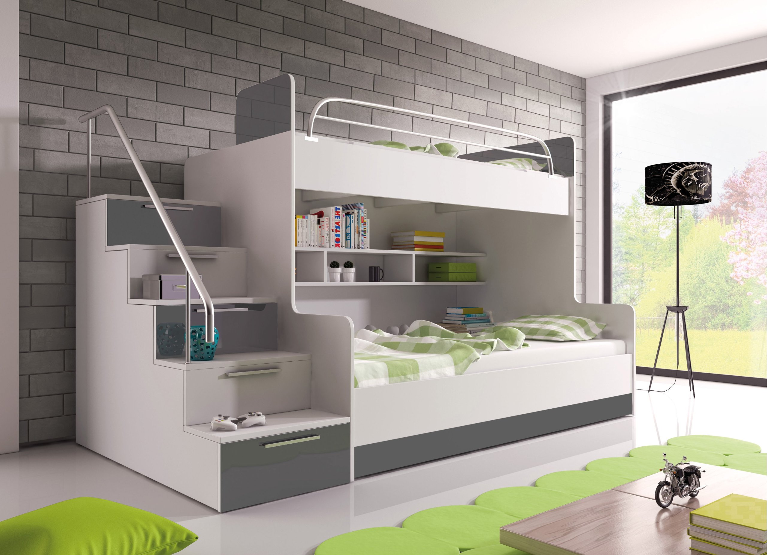 Кровать отличается современным дизайном и тщательной обработкой, обеспечивающей исключительно хороший сон и гарантию безопасности и уверенности в том, что ваш ребенок проснется отдохнувшим. Фасады гарнитура выполнены из глянцевого мебельного МДФ насыщенных цветов, что позволит подобрать мебель к любому помещению. Верхняя спальная поверхность и ступеньки рядом с кроватью оборудованы перилами, которые защитят ребенка от выпадения.