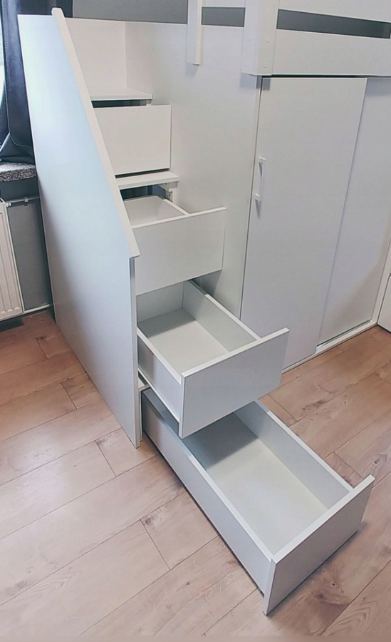 Под нижней кроватью есть два просторных ящика, которые работают на резиновых роликах. При желании мы можем заменить их ящиками на гидах или третьей кровати.