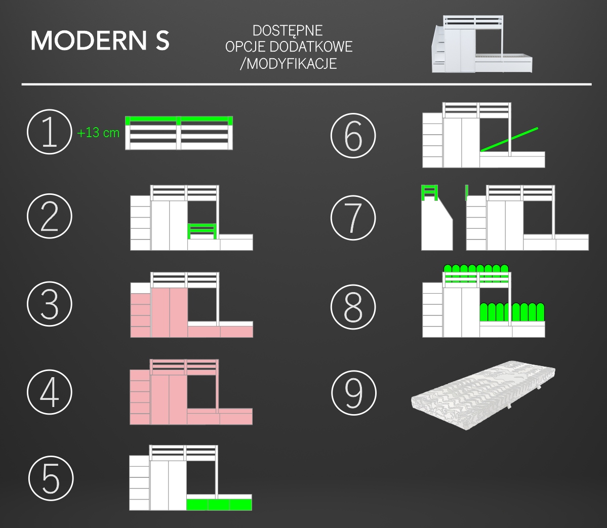 Кровать требует прикручивания к стене в одном месте, незаметном снаружи. Благодаря широким возможностям оформления Modern идеально подходит как для детей младшего возраста, так и для подростков. Все конструкции отгружаются в частично собранном виде на поддоне или доставляются собственным транспортом – в зависимости от расстояния.