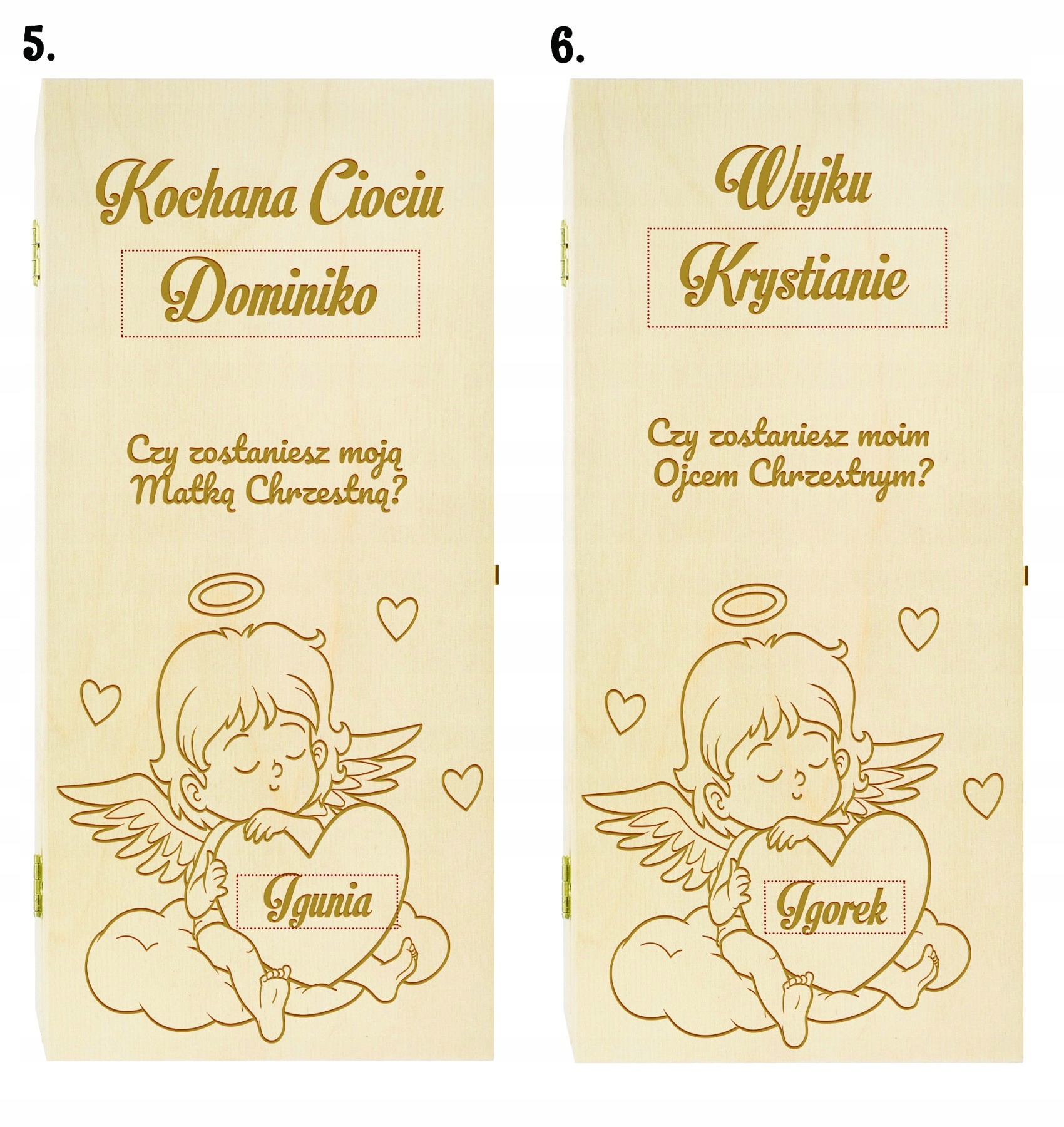 Коробка для вина — отличная идея, когда мы хотим задать очень важный вопрос. Гравировка на коробке – непростая просьба. Такой подарок подчеркивает важность события и ту роль, которую крестные родители сыграют для нашего ребенка.