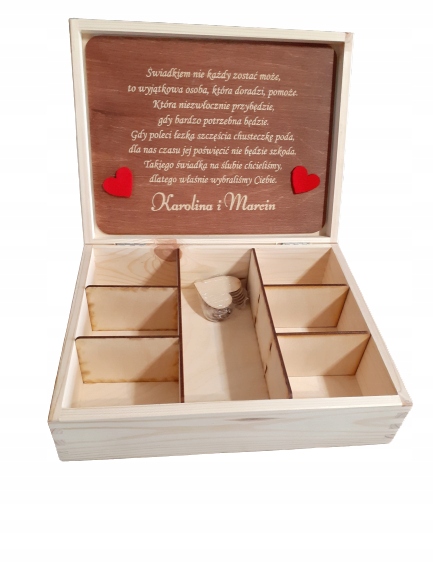 Деревянная шкатулка содержит семь отделений с выгравированными сувенирными сердечками.