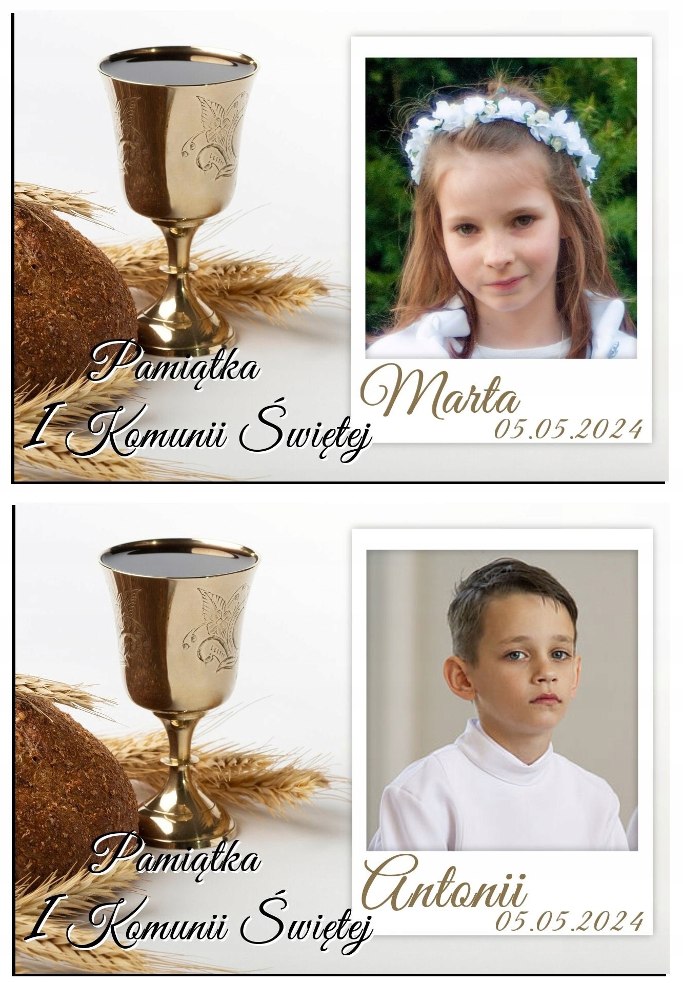 Спасибо за первое причастие от мальчика или девочки, сувенир для гостей в форме прямоугольника с фотографией вашего ребенка, именем и датой.