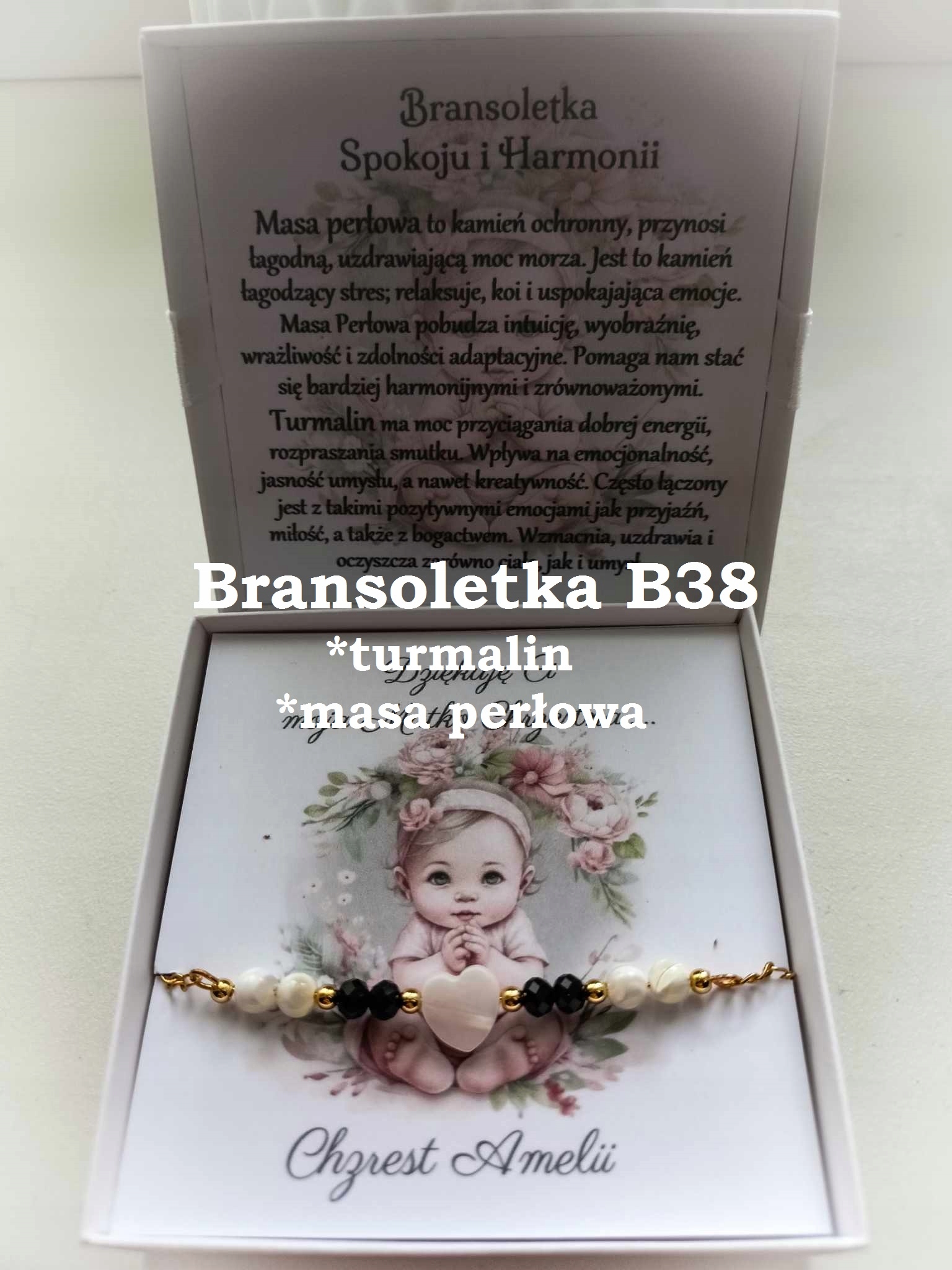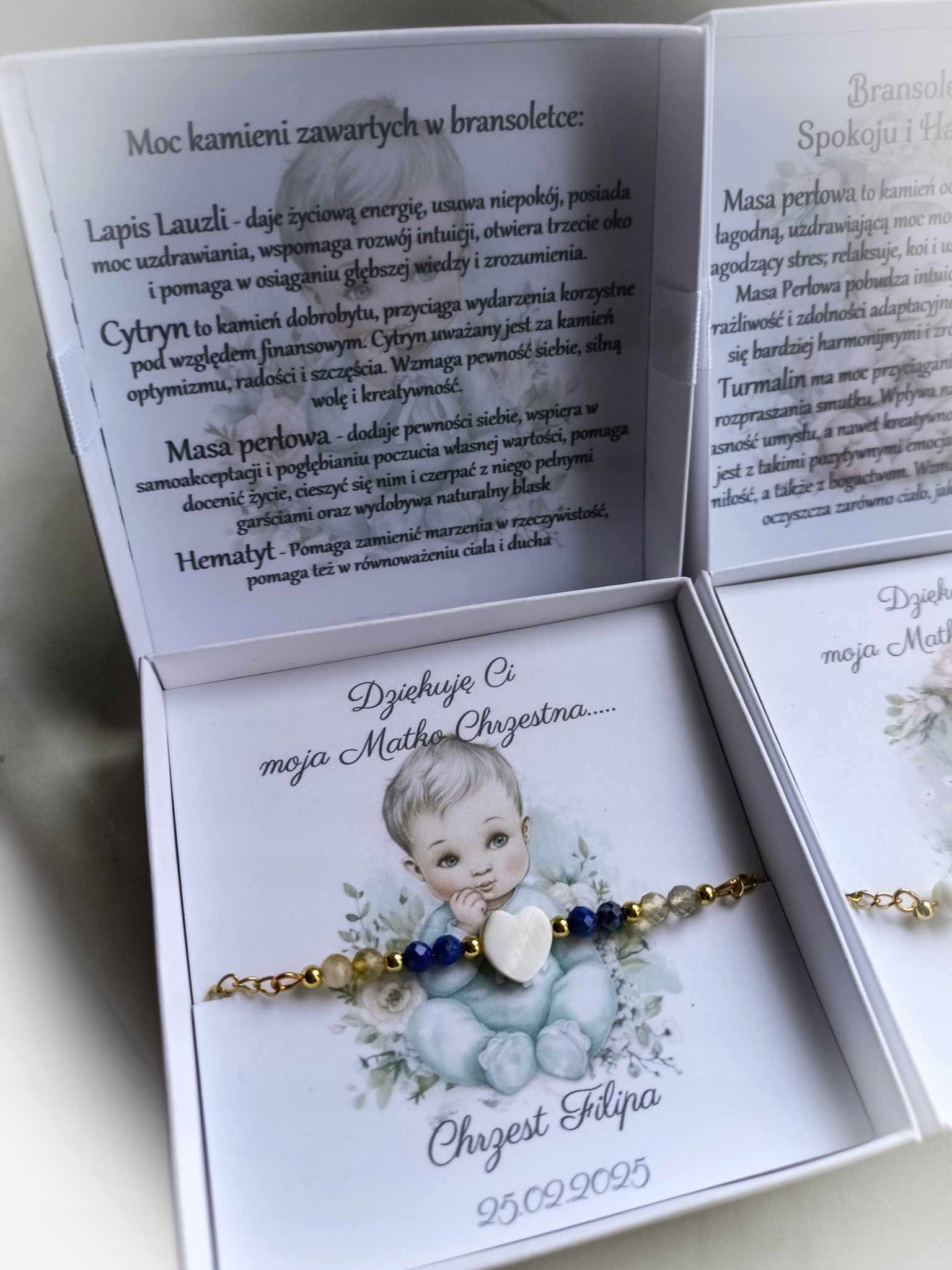 Каждый браслет упакован в декоративную белую коробку, отделанную белым луком с персонализированной картой, выбранной в зависимости от церемонии и пола ребенка. Эти камни не только выглядят красиво, но и приносят позитивную энергию. эта информация вставлена «Фабрика», вам не нужно помещать ее в сообщение при покупке