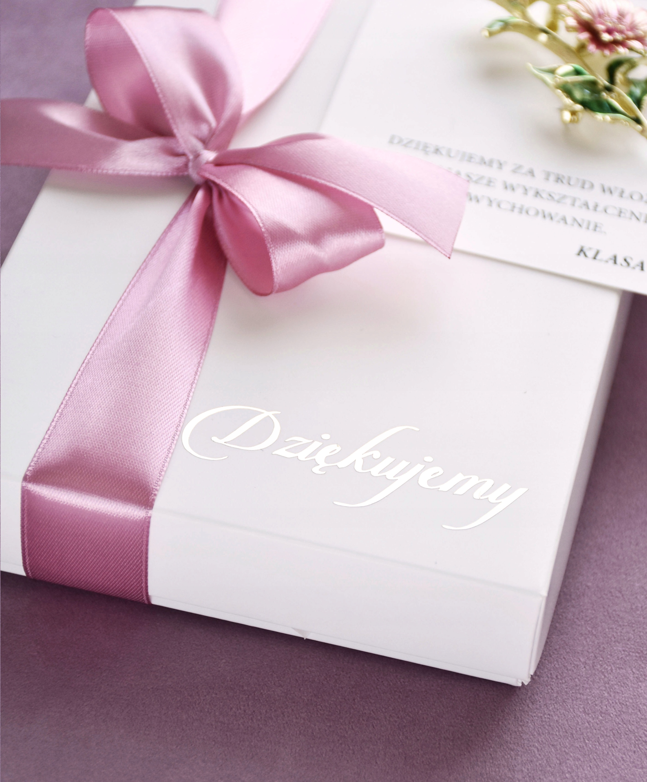 - Белая коробка , украшенная внешней, с помощью ленты и золотистого надписи