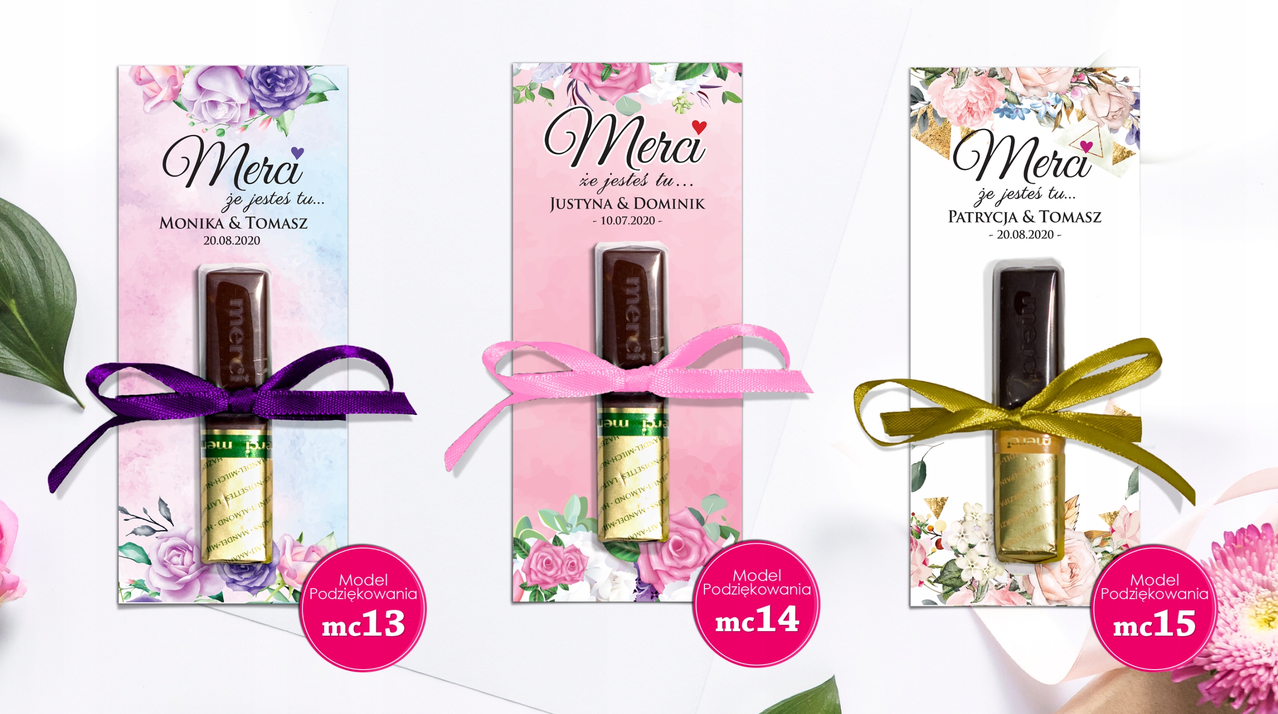 Благодарственные письма для гостей MERCI, украшенные атласной лентой шириной 6 мм.