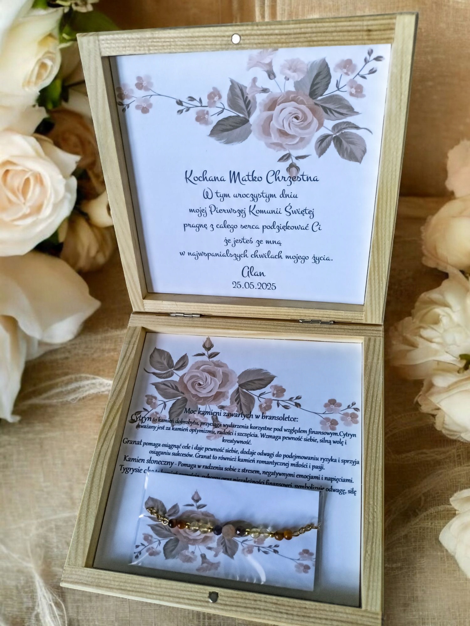 Спасибо в элегантной деревянной коробке с браслетом из природных камней