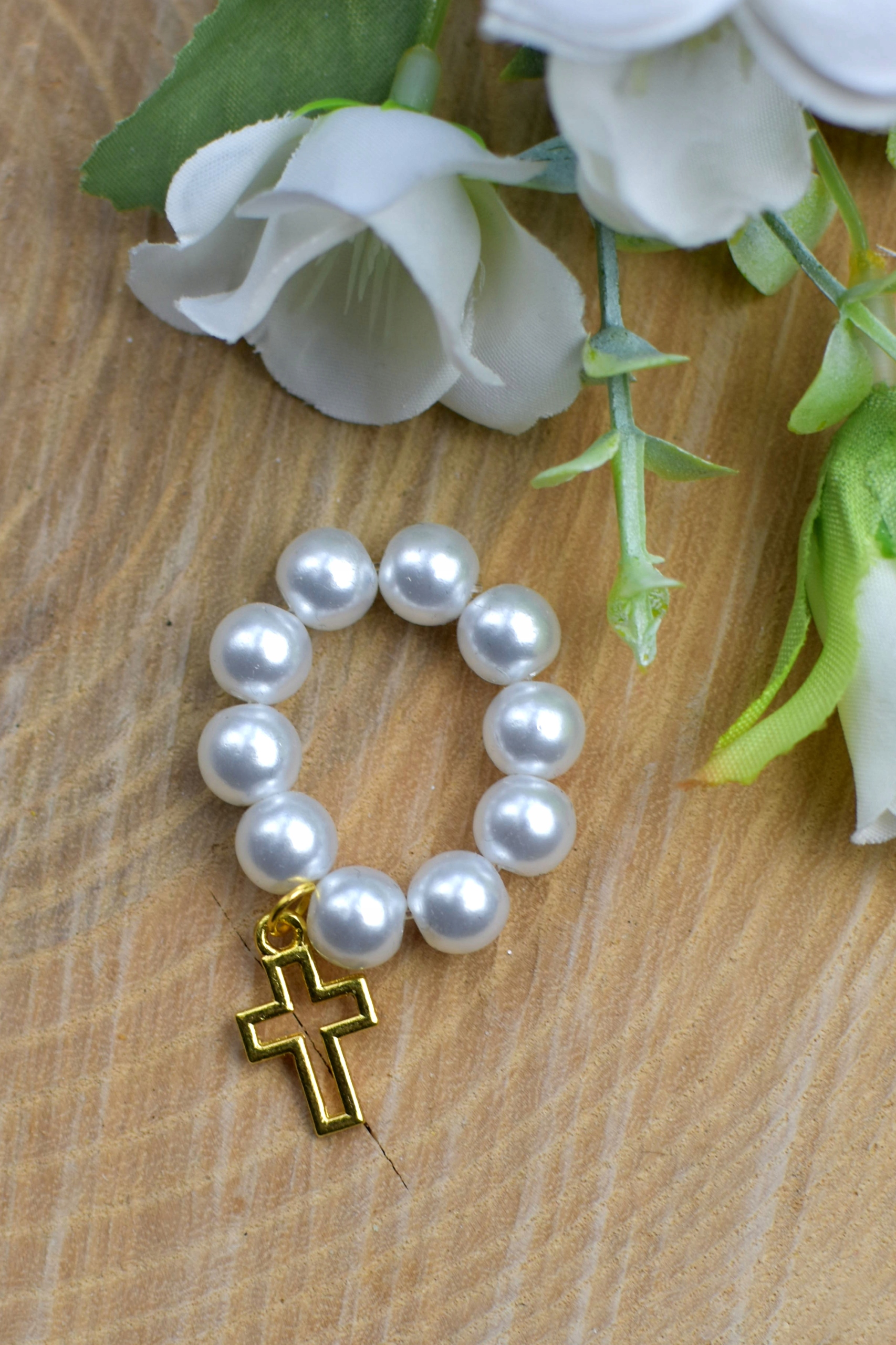 Декада четок из пластиковых бусин, имитирующих жемчуг, и металлического креста золотого цвета.