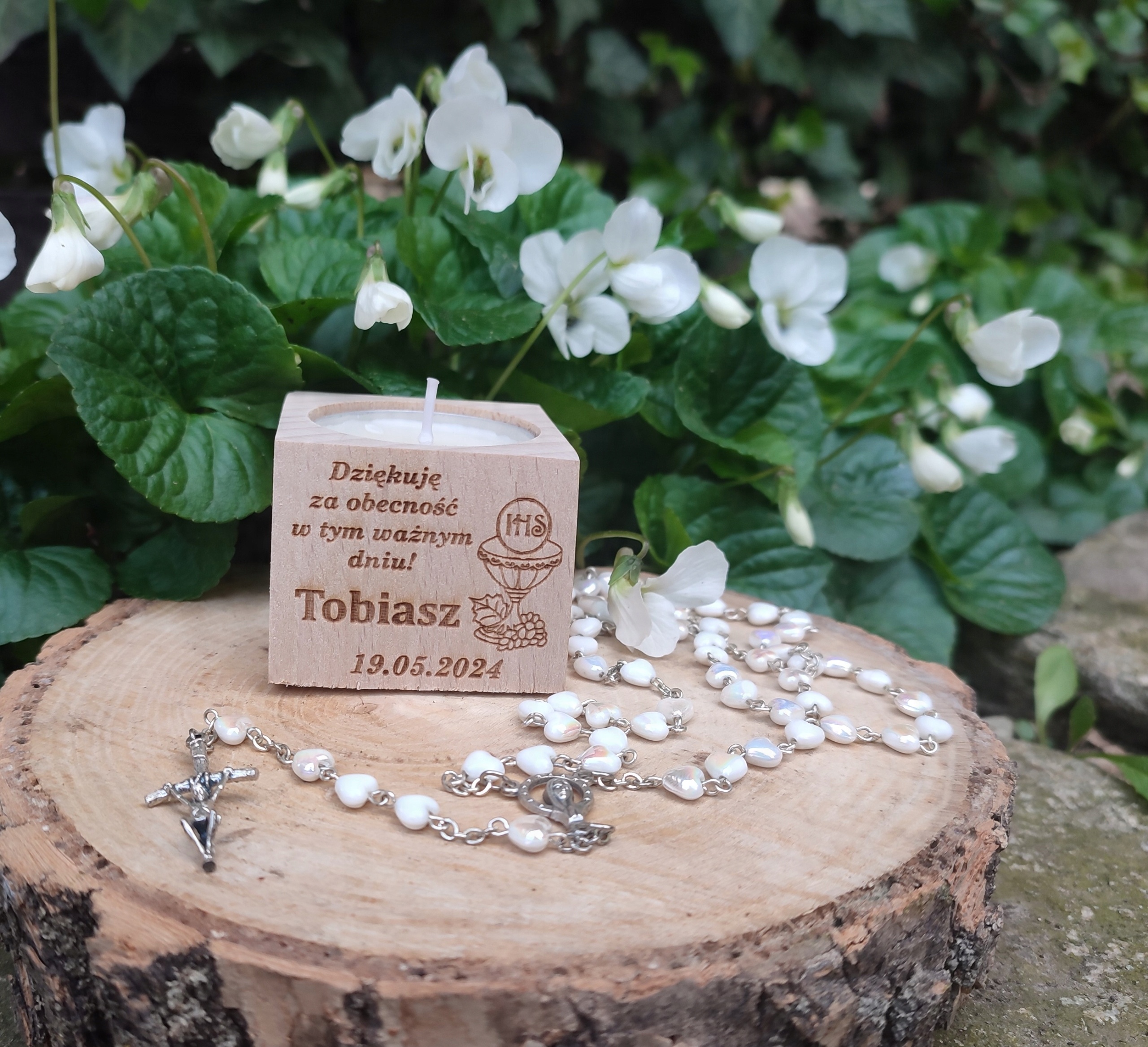 Деревянный подсвечник с гравировкой - красивый сувенир и благодарность гостям, пришедшим на Первое Святое Причастие вашего ребенка. Подсвечник можно персонализировать, выбрав один из доступных дизайнов.