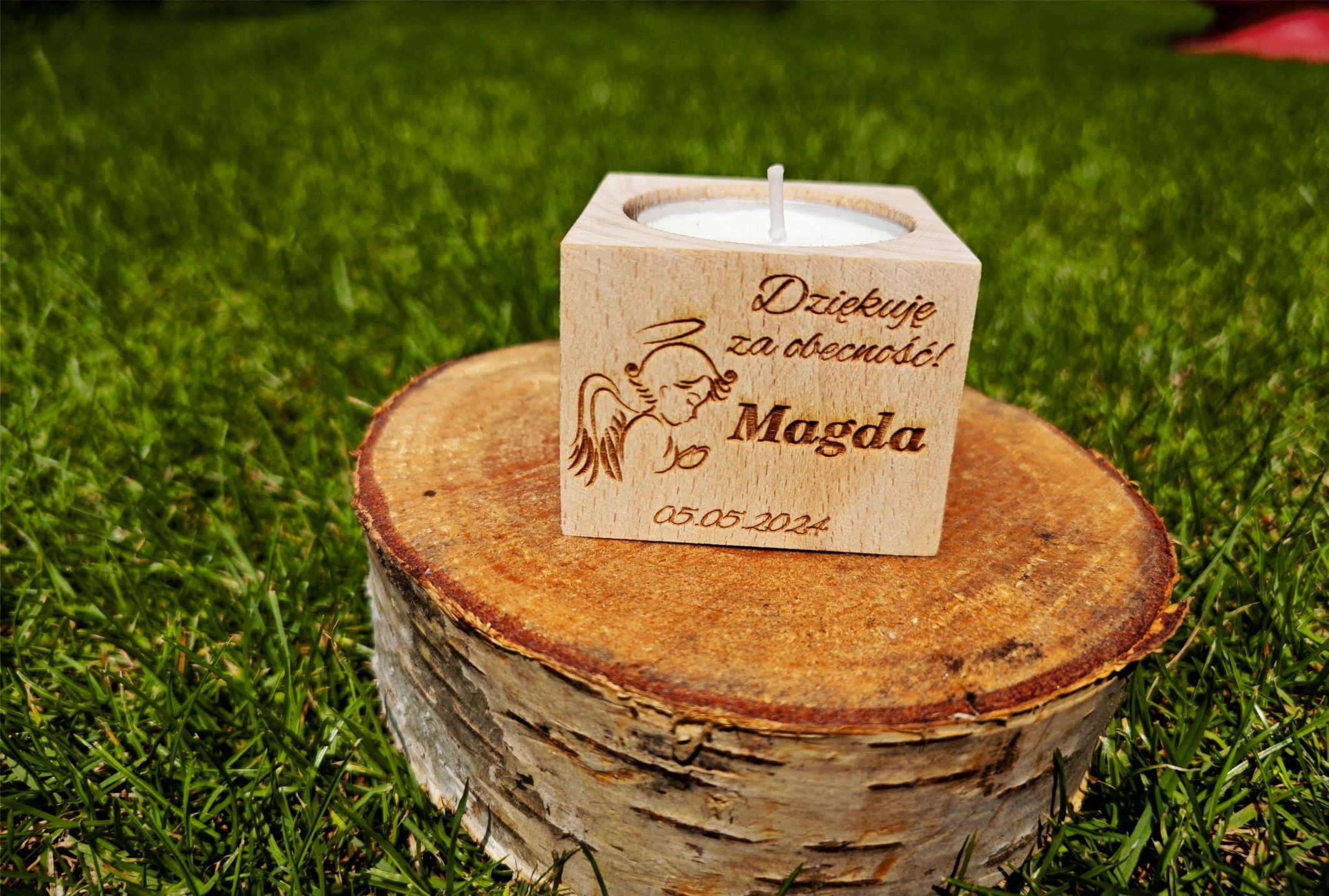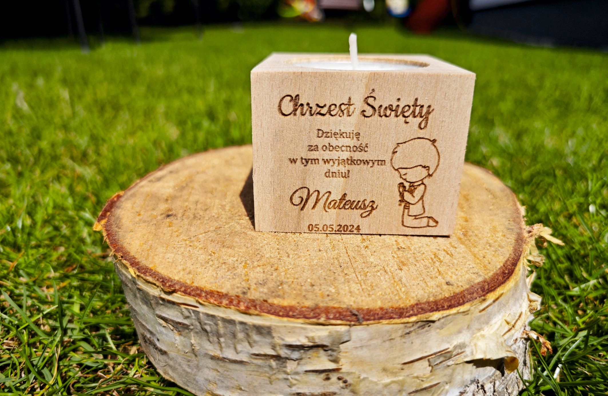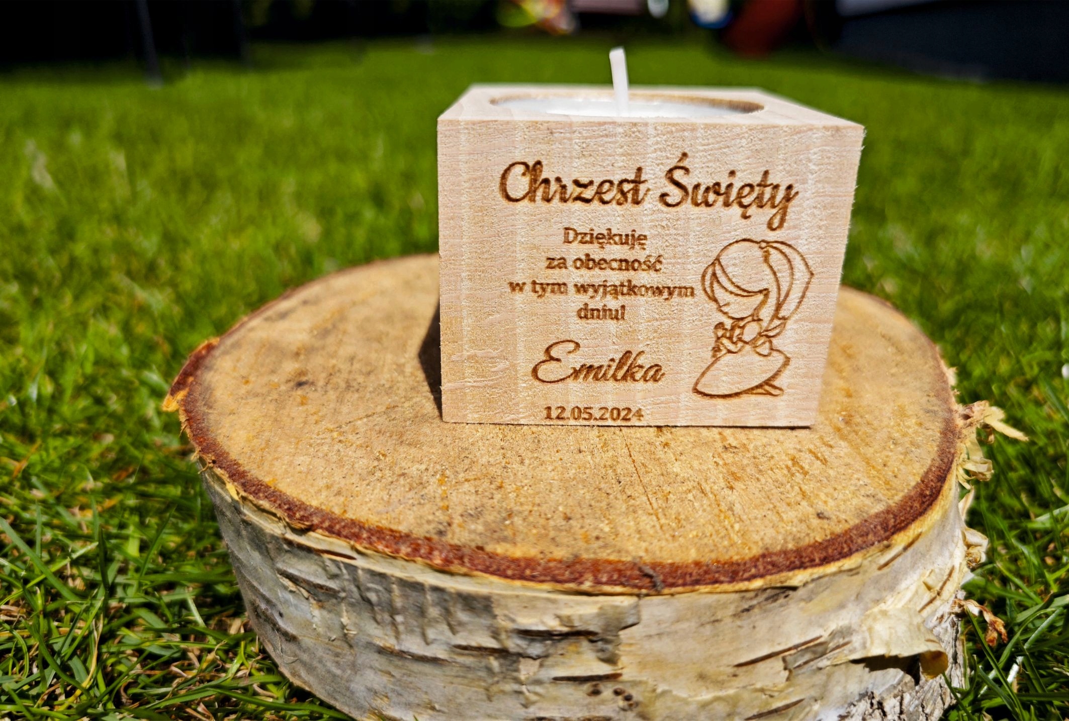 Деревянный подсвечник с гравировкой - красивый сувенир и благодарность гостям, пришедшим на Святое Крещение вашего ребенка. Подсвечник можно персонализировать, выбрав один из доступных дизайнов.