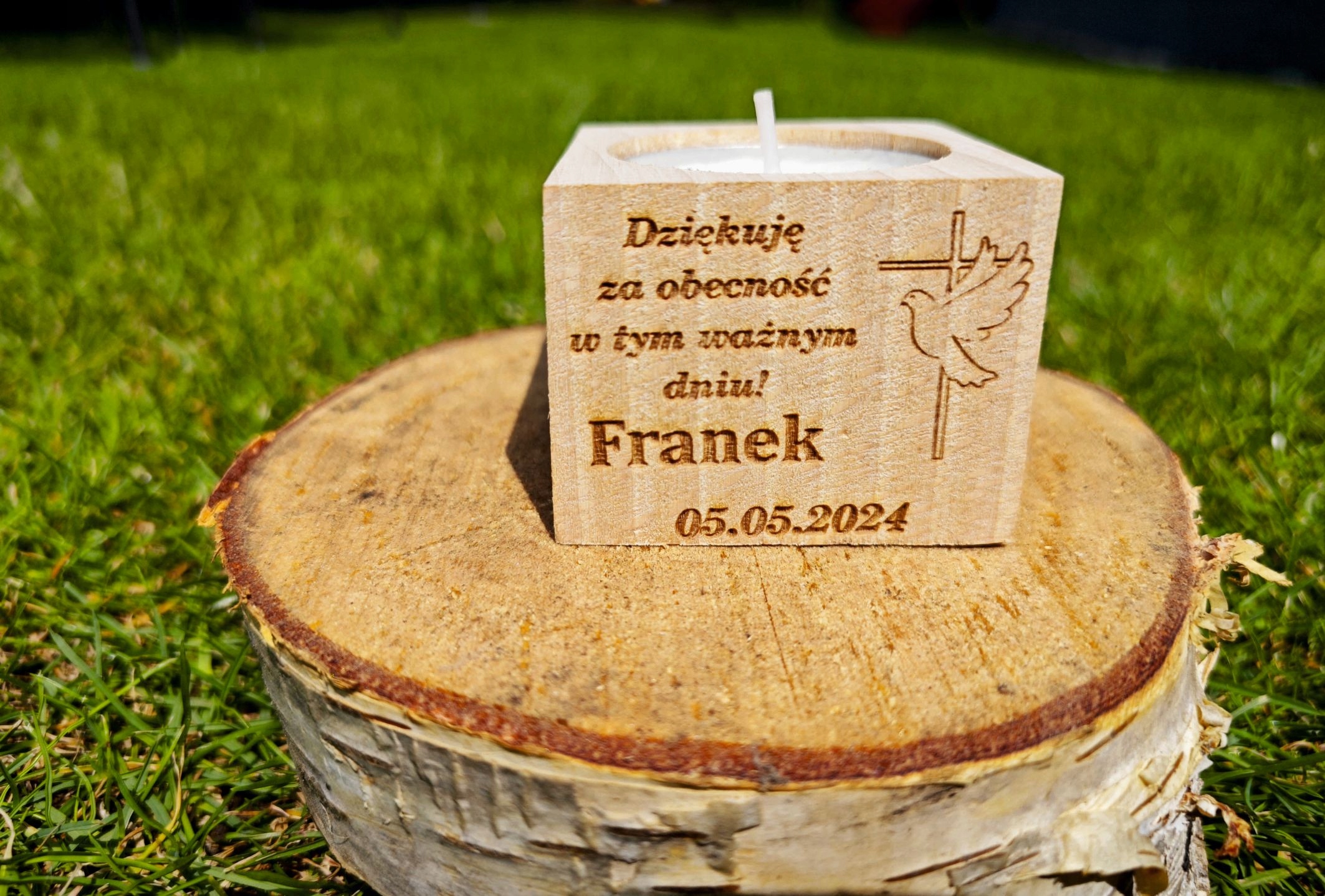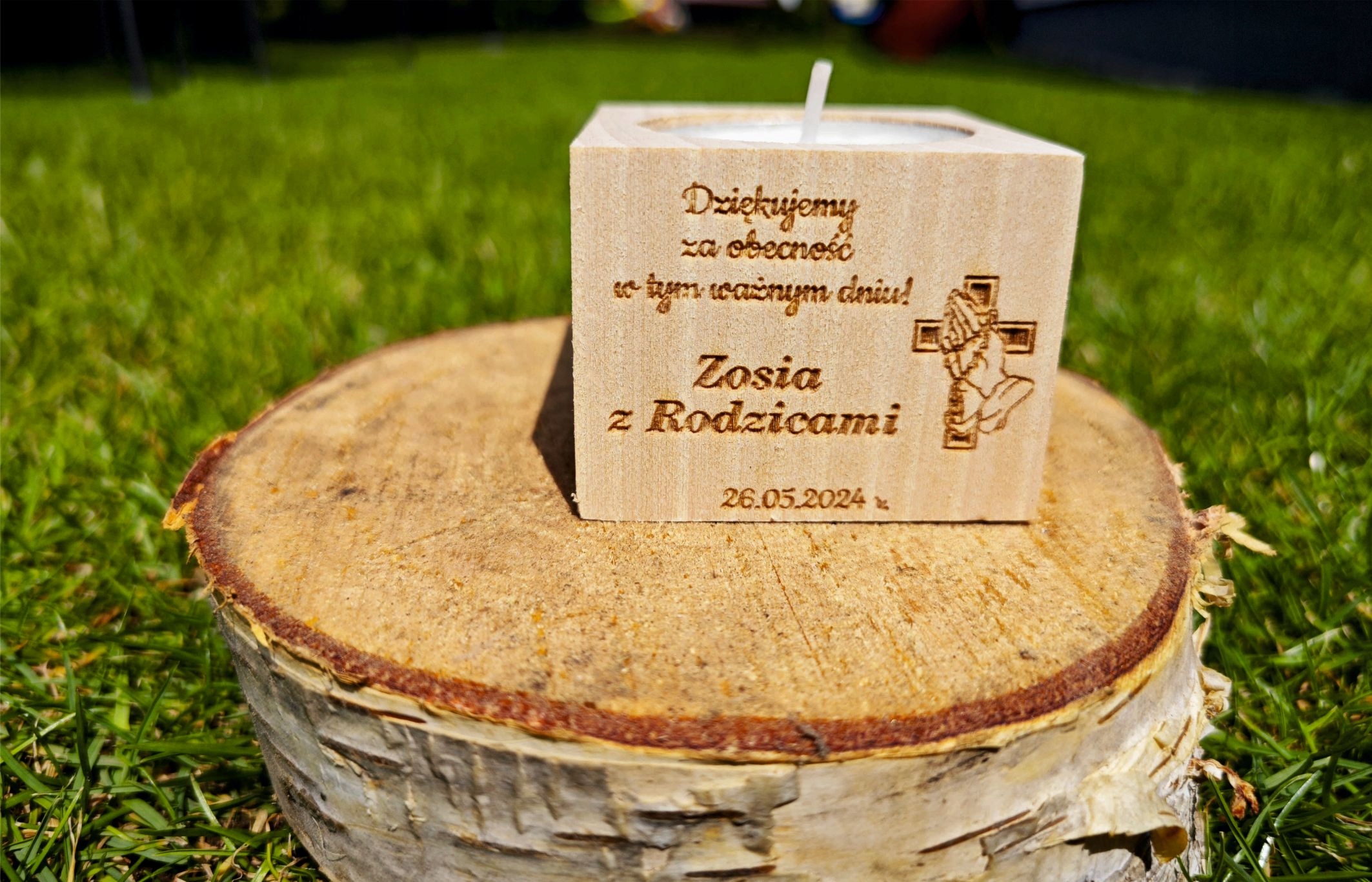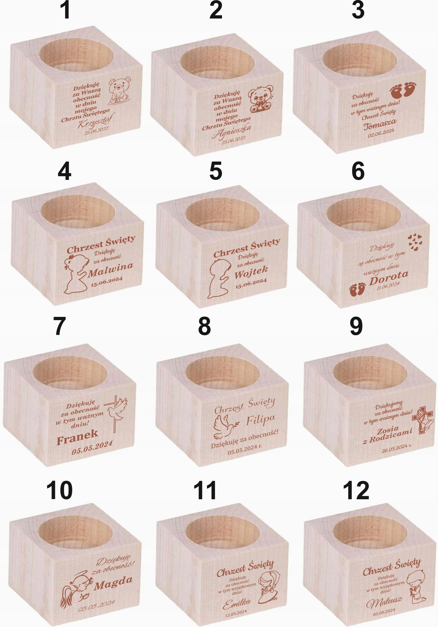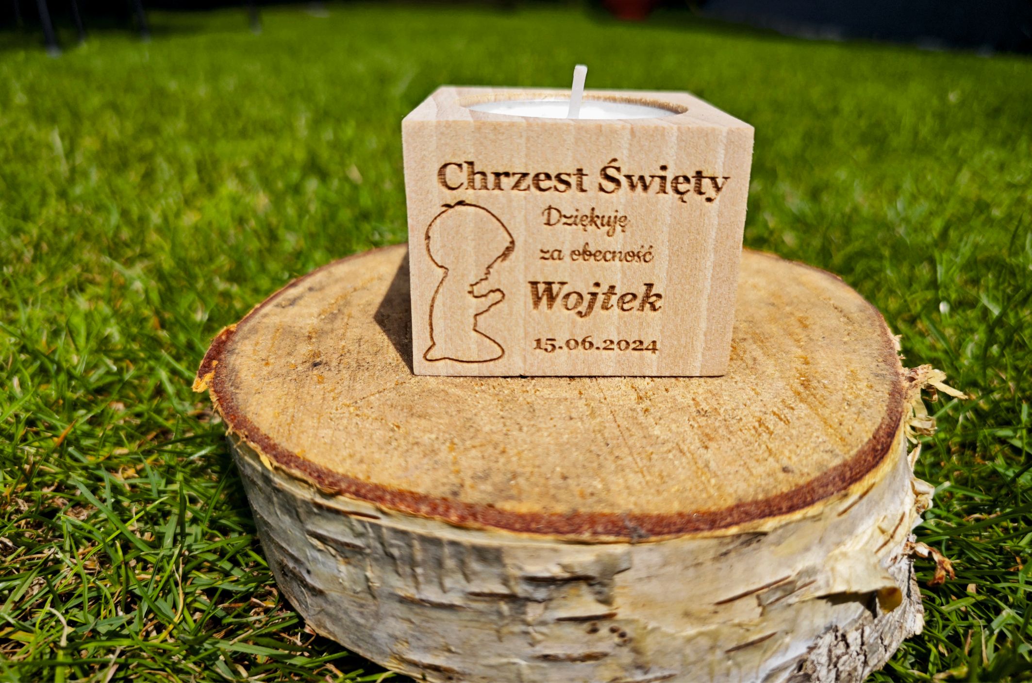 Деревянный подсвечник с гравировкой - красивый сувенир и благодарность гостям, пришедшим на Святое Крещение вашего ребенка. Подсвечник можно персонализировать, выбрав один из доступных дизайнов.