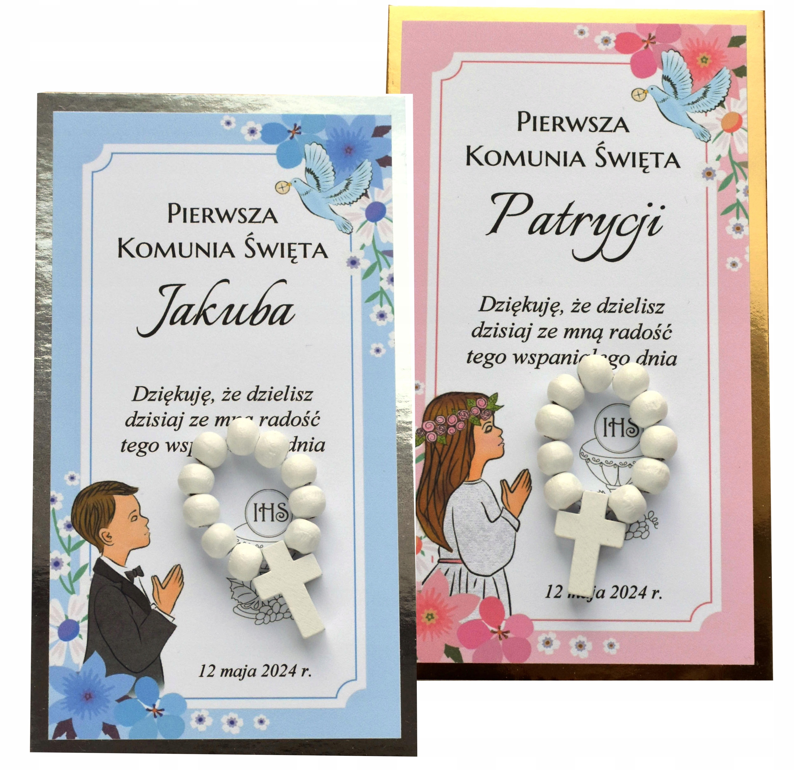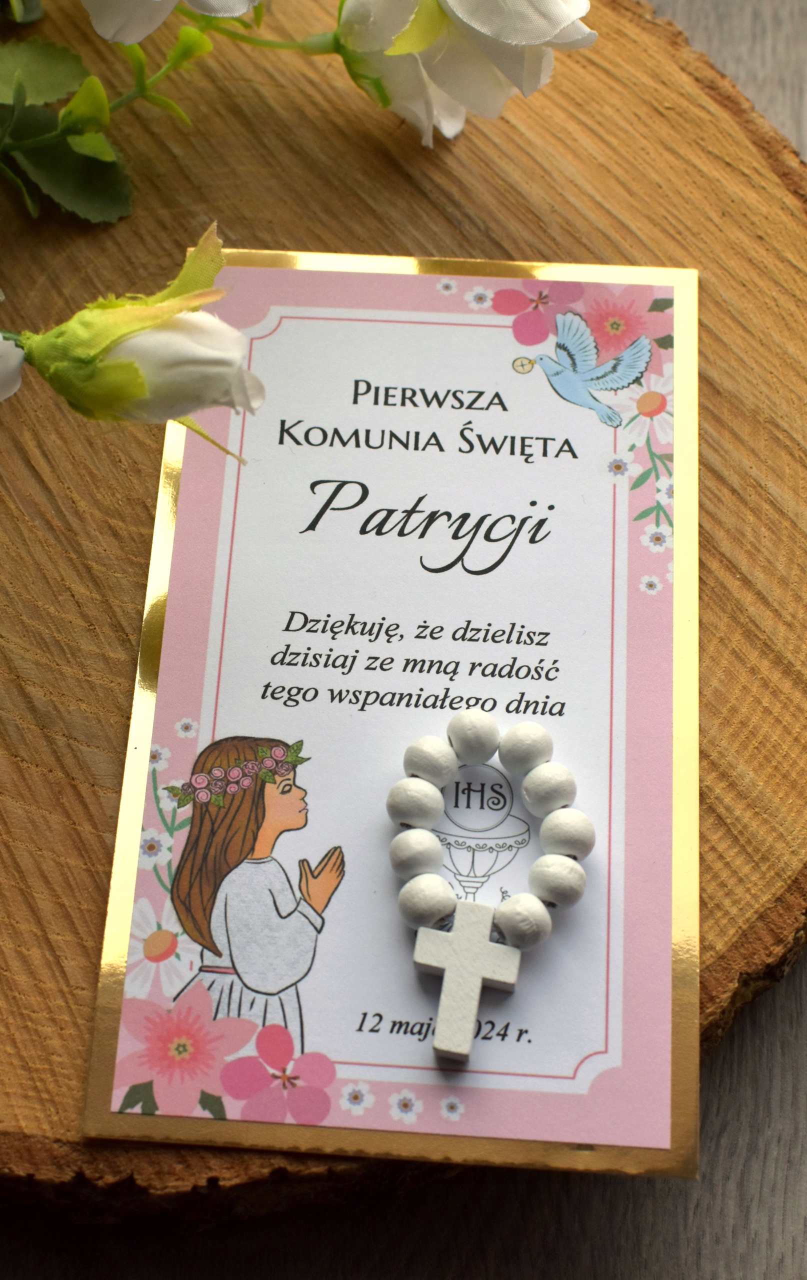 Подарок с именной благодарственной надписью, содержащей десятилетие четки из деревянных бусин и деревянный крестик, выкрашенные в белый цвет.