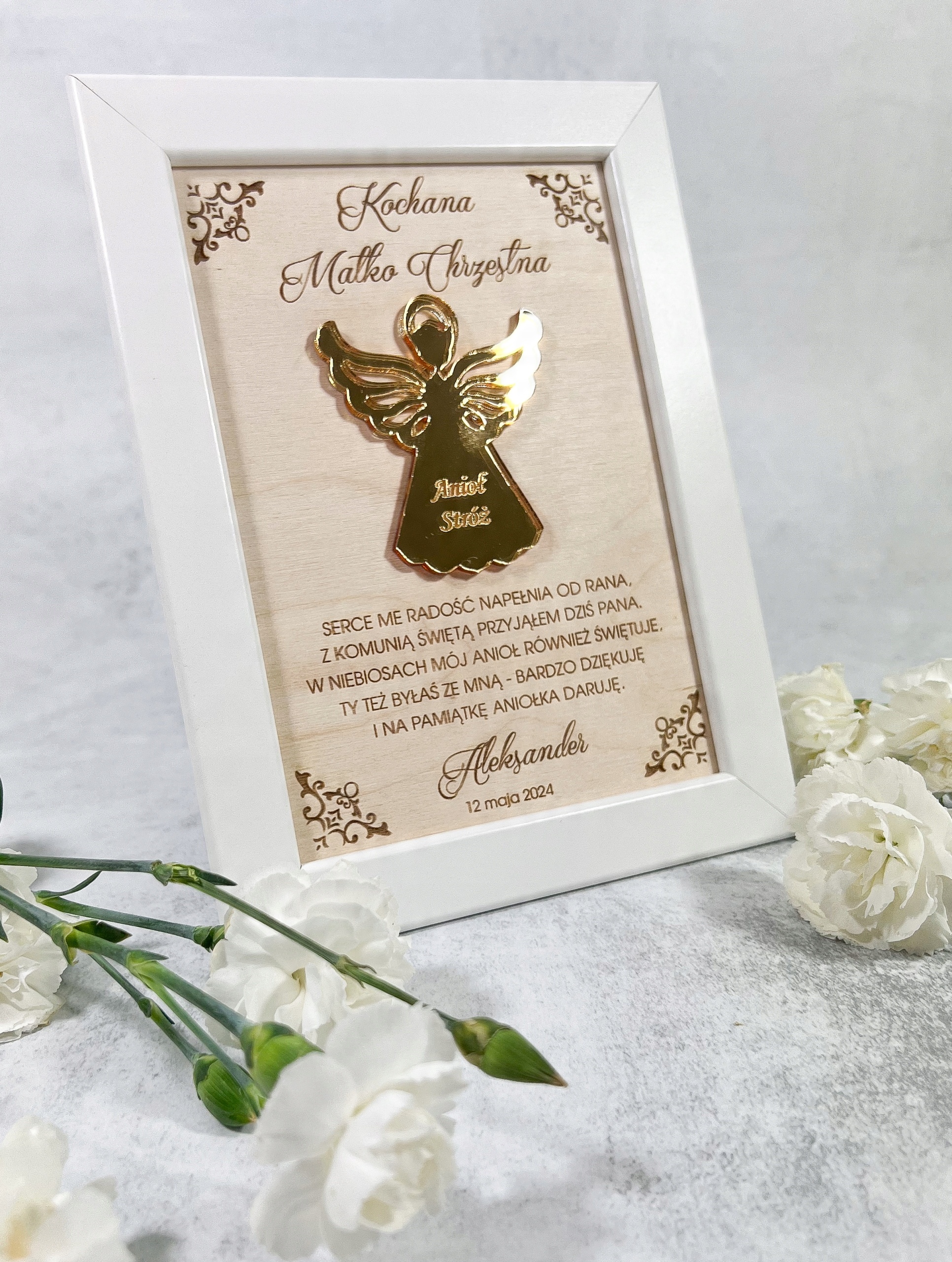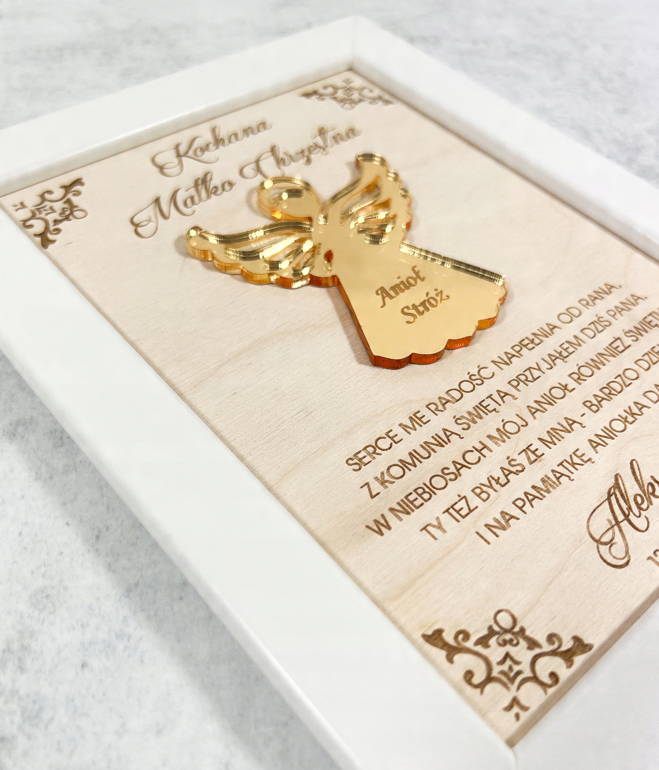 Белая рамка с золотым Ангелом-Хранителем. Красивый сувенир к Первому Причастию.