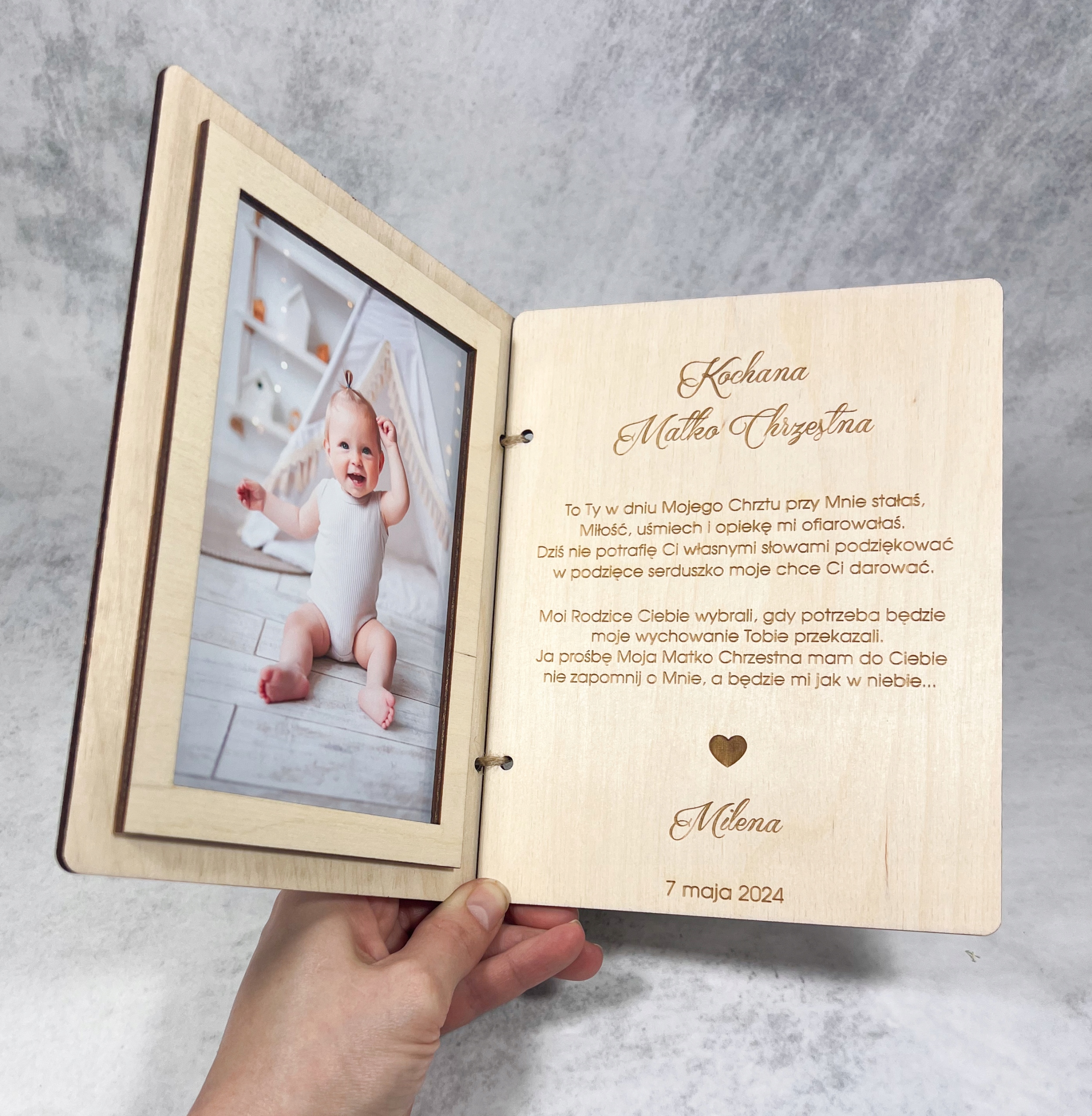 Красивый сувенир ко Святому Крещению. Деревянная открытка с фоторамкой и благодарственным письмом крестным.