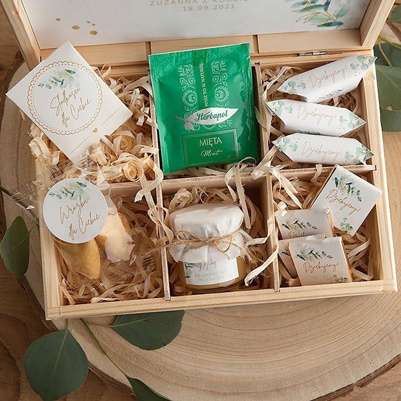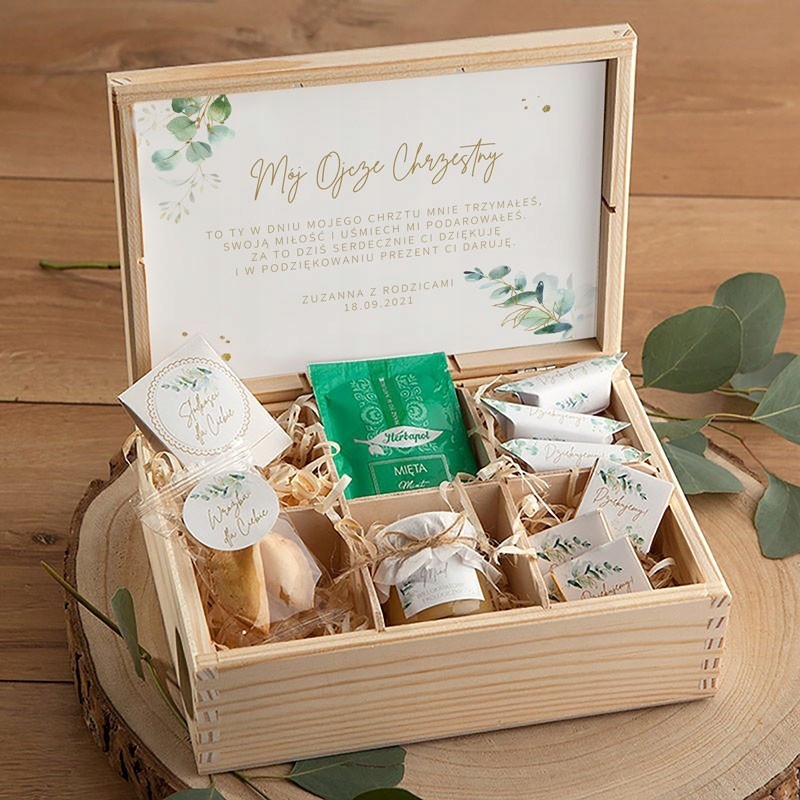- Состав: деревянная коробка с отделениями, в которых были разложены сладости: 3 шт сливочной помадки, 6 шт молочных шоколадных конфет, баночка с многоцветочным польским медом и сладким фруктовым леденцом в коробке, пакете. полезного зеленого чая и печенья с предсказанием; каждый элемент набора имеет последовательный мотив эвкалипта; Коробка облицована декоративной древесной шерстью, а на крышке имеется наклейка с текстом благодарности крестным родителям и соответствующим графическим мотивом.