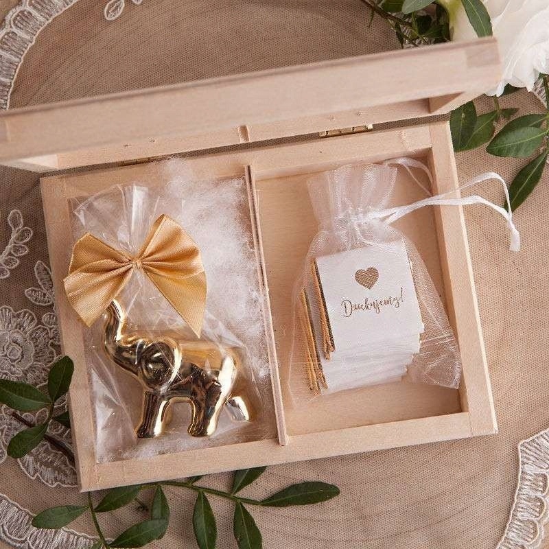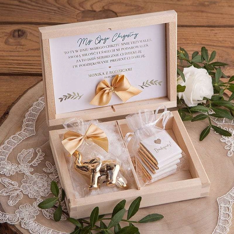 Красивый подарок-спасибо Крестной и Крестному отцу, заключенный в деревянную коробку. Внутри коробки находится золотой слоник, который подарит счастье любимому человеку, и молочный шоколад. Все выглядит великолепно!