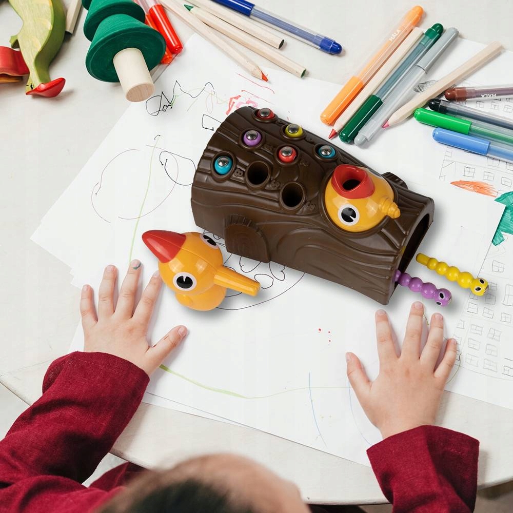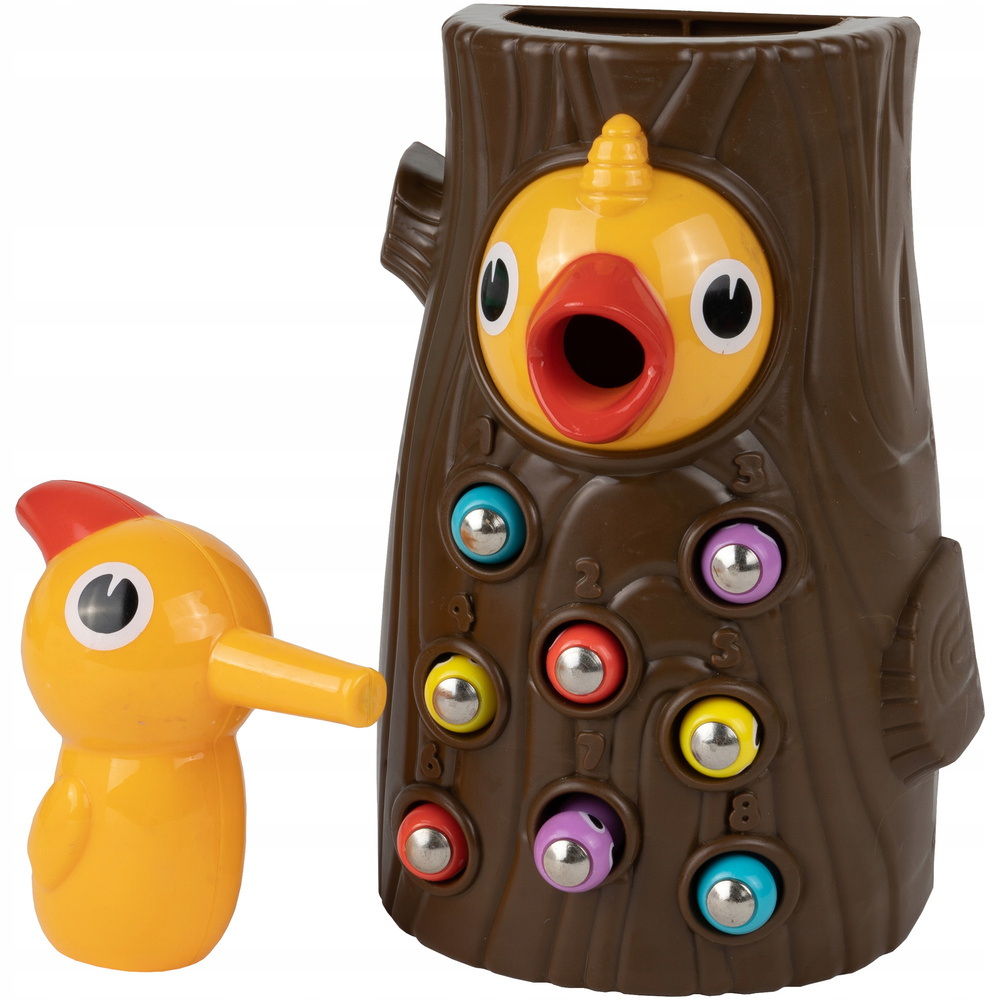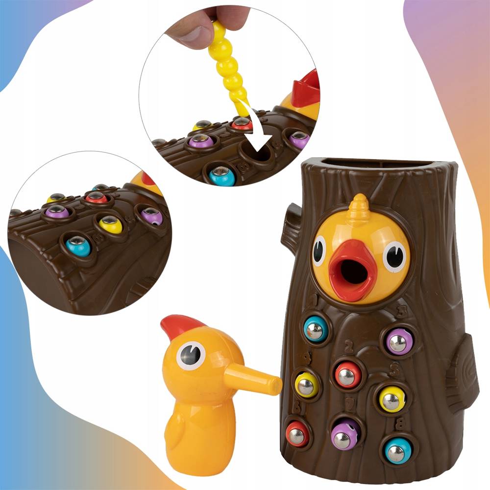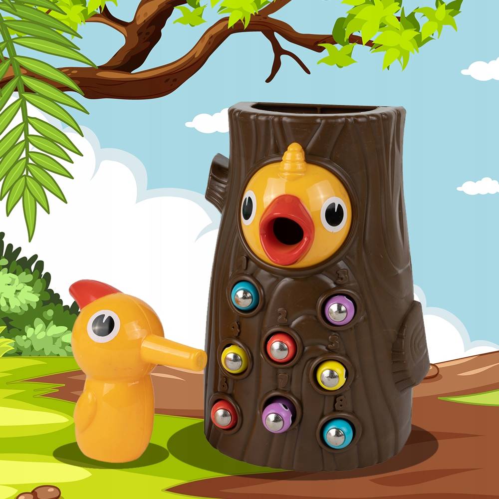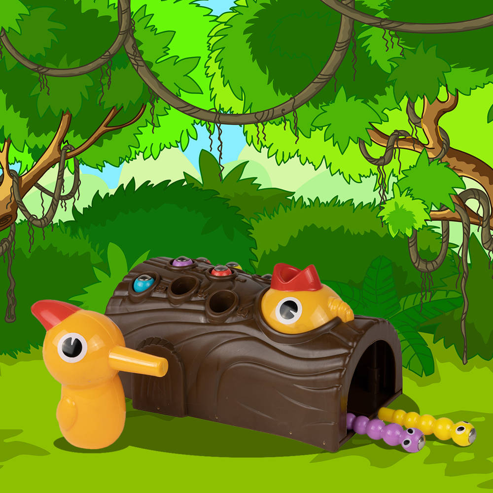 Благодаря магнитным элементам в игру можно играть где угодно — батарейки не требуются! Задача ребенка — взять на себя роль птицы-матери и с помощью птицы вытащить червячков из бревна и точно поместить их в клюв голодному птенцу.