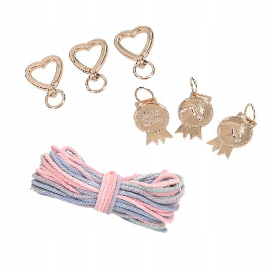 Набор включает в себя три карабинера с золотым металлическим сердцем, три золотых подвеска в форме медальонов и 10 метров хлопковой ленты с красивым градиентом.