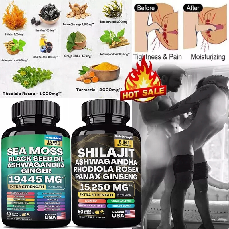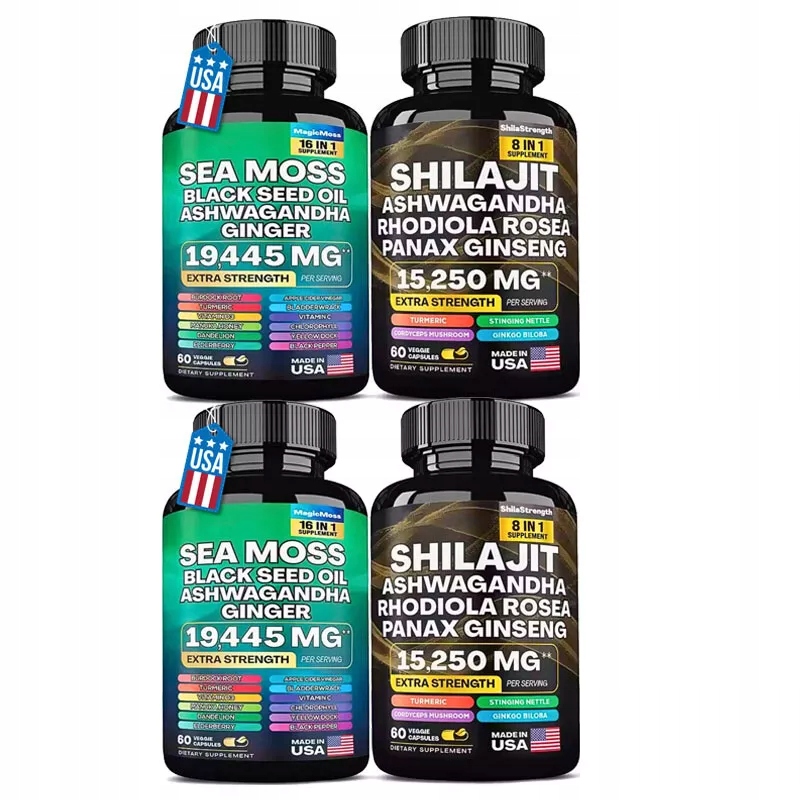 60 штук (набор 1): Морской мох 7000 мг Масло черного тмина 4000 мг Ашваганда 2000 мг Куркума 2000 мг Пузырчатка 2000 мг Лопух 2000 мг и имбирь Витамин С Витамин D3 из ягод бузины Манука Одуванчик Желтый щавель Хлорофилл ACV