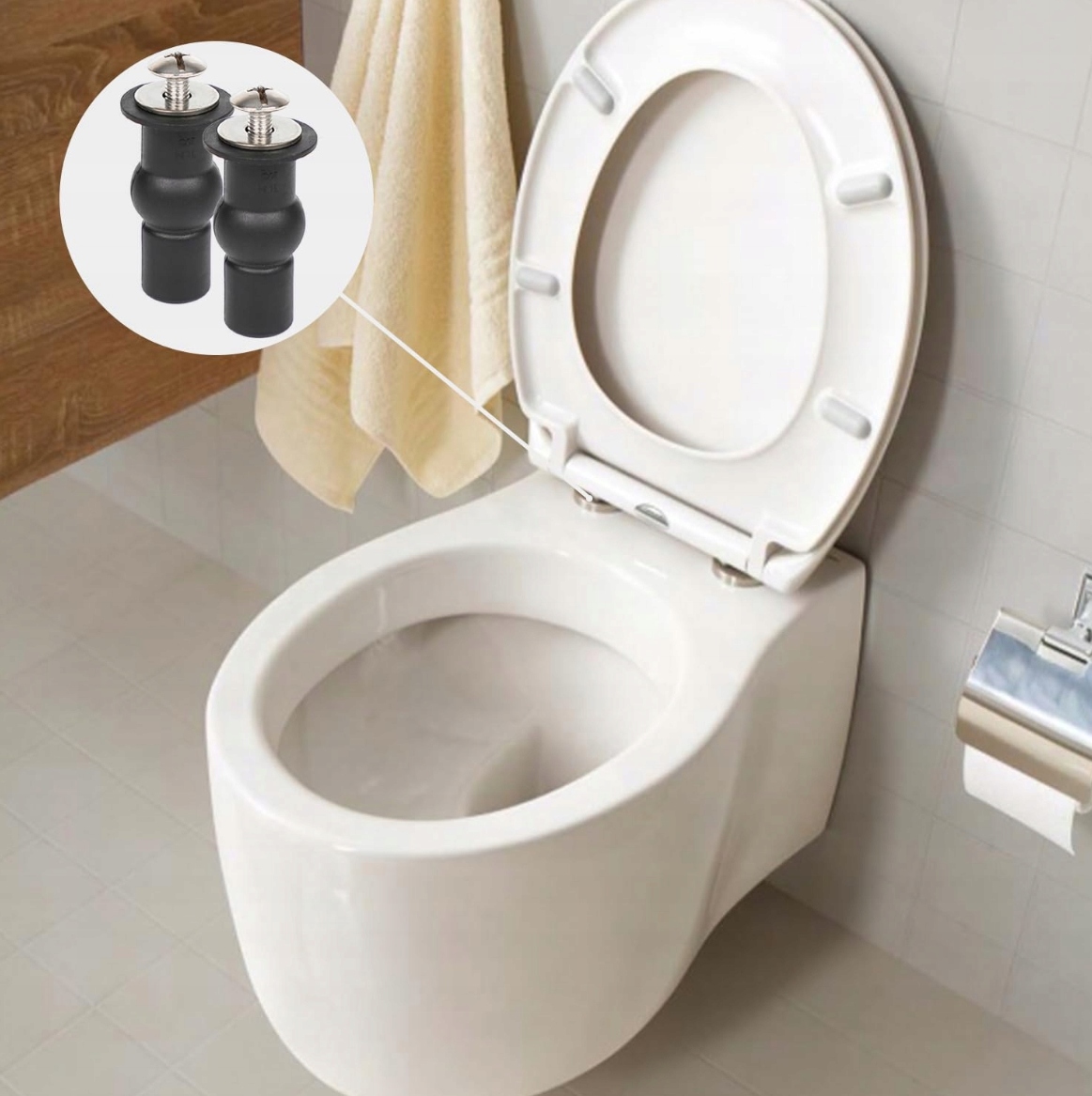 Если сиденье унитаза все еще движется, замените старый крепеж нашим винтом для сиденья унитаза, чтобы сиденье унитаза можно было надежно зафиксировать с обеих сторон.