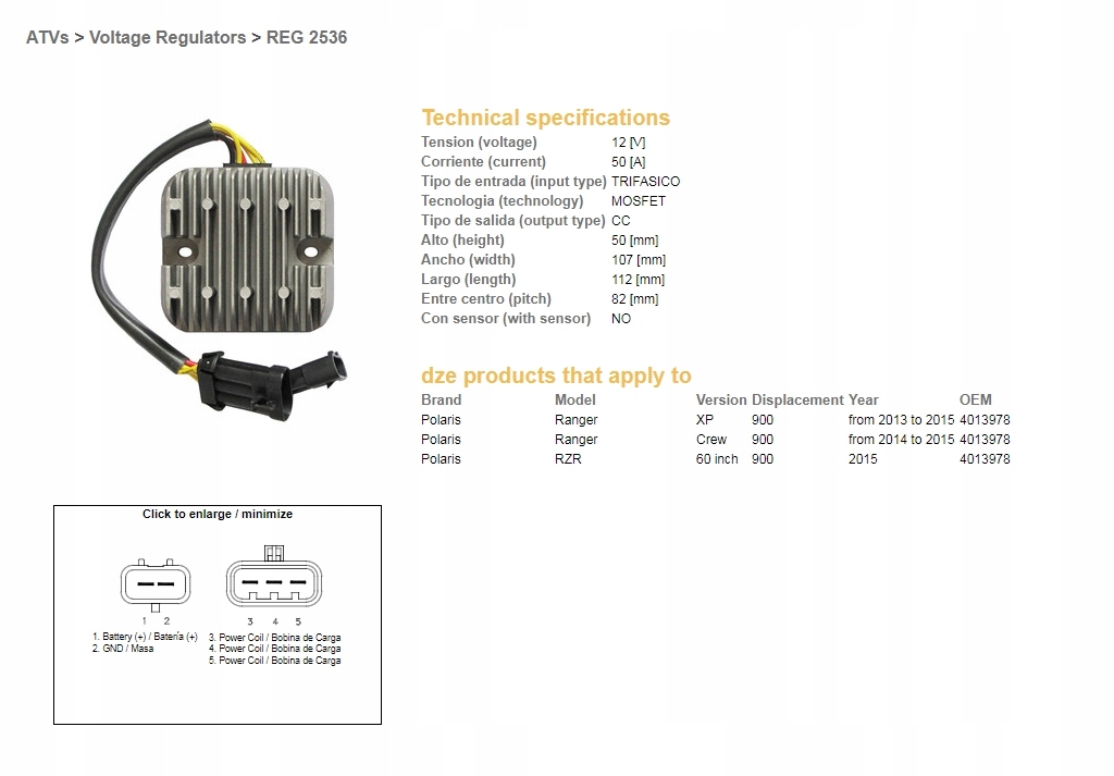РЕГУЛЯТОР НАПРЯЖЕНИЯ DZE POLARIS RANGER 900 XP/CREW/60 '13-'15 MOSFET - 50A (