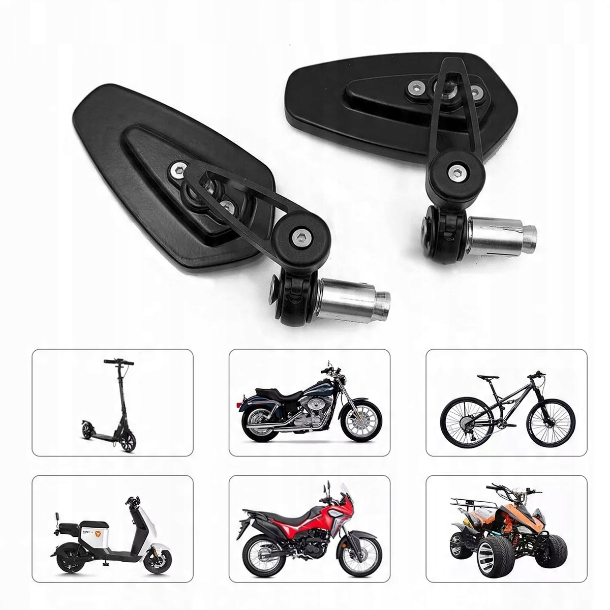 【Широкое применение】Эта пара мотоциклетных зеркал совместима с большинством двигателей и подходит для большинства марок мотоциклов, скутеров, квадроциклов, уличных мотоциклов, внедорожных мотоциклов, электрических мотоциклов и мопедов. Их также можно устанавливать на велосипеды.