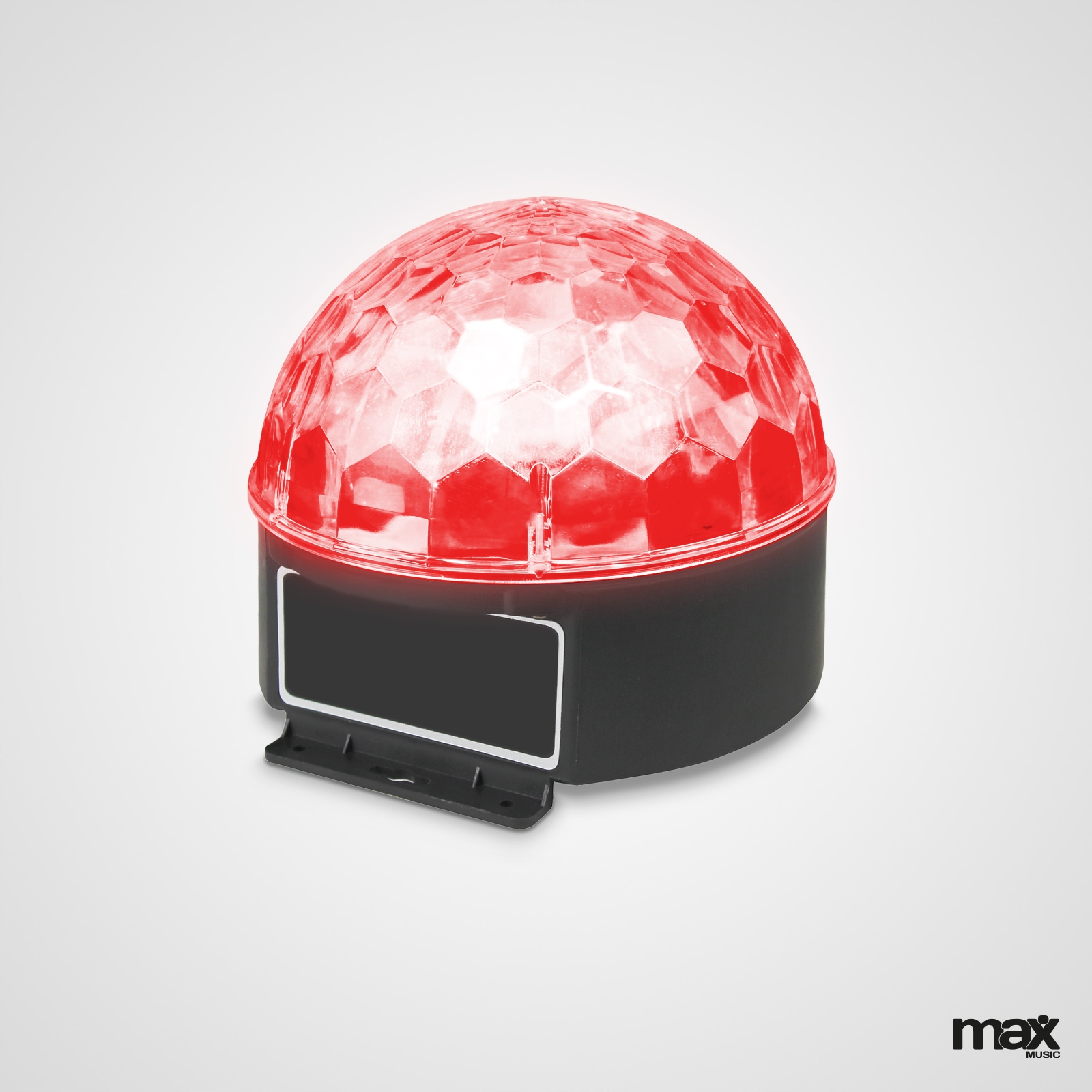 Этот шар, вдохновленный современной светодиодной технологией, оснащен 6 светодиодами общей мощностью 6 Вт, которые в сочетании с 82 интенсивными световыми лучами и кристально чистым светящимся шаром создают динамический эффект меняющихся цветов.