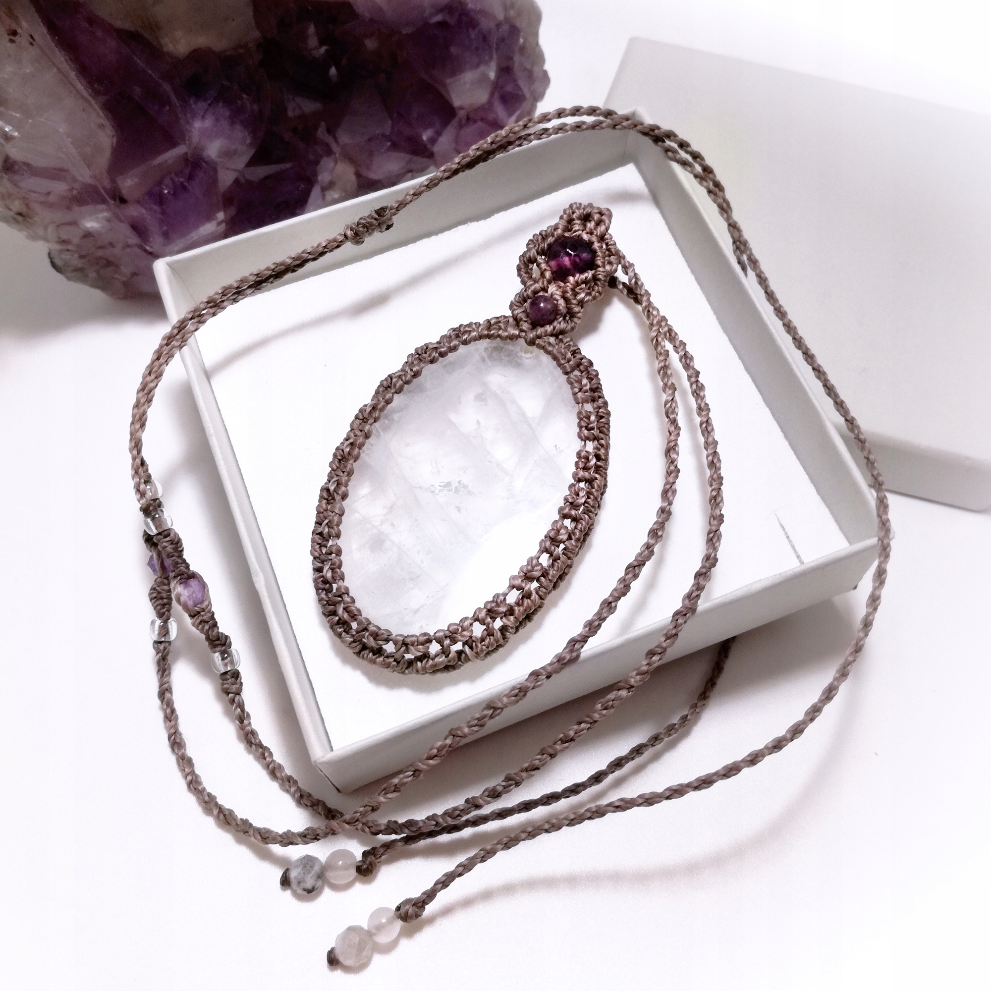 Дзеркальне плетене намисто, гірський кришталь, флюорит, мікромакраме