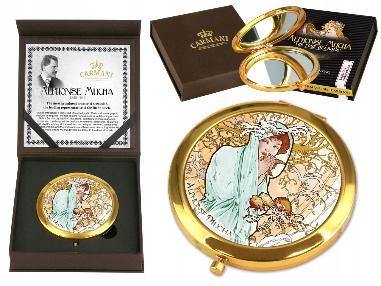Маленькое, маленькое зеркало с мотивом творчества Альфонс Муда. Идеально подходит для каждой женской сумки. Он занимает мало места, и его красивые украшения добавляют очарование.