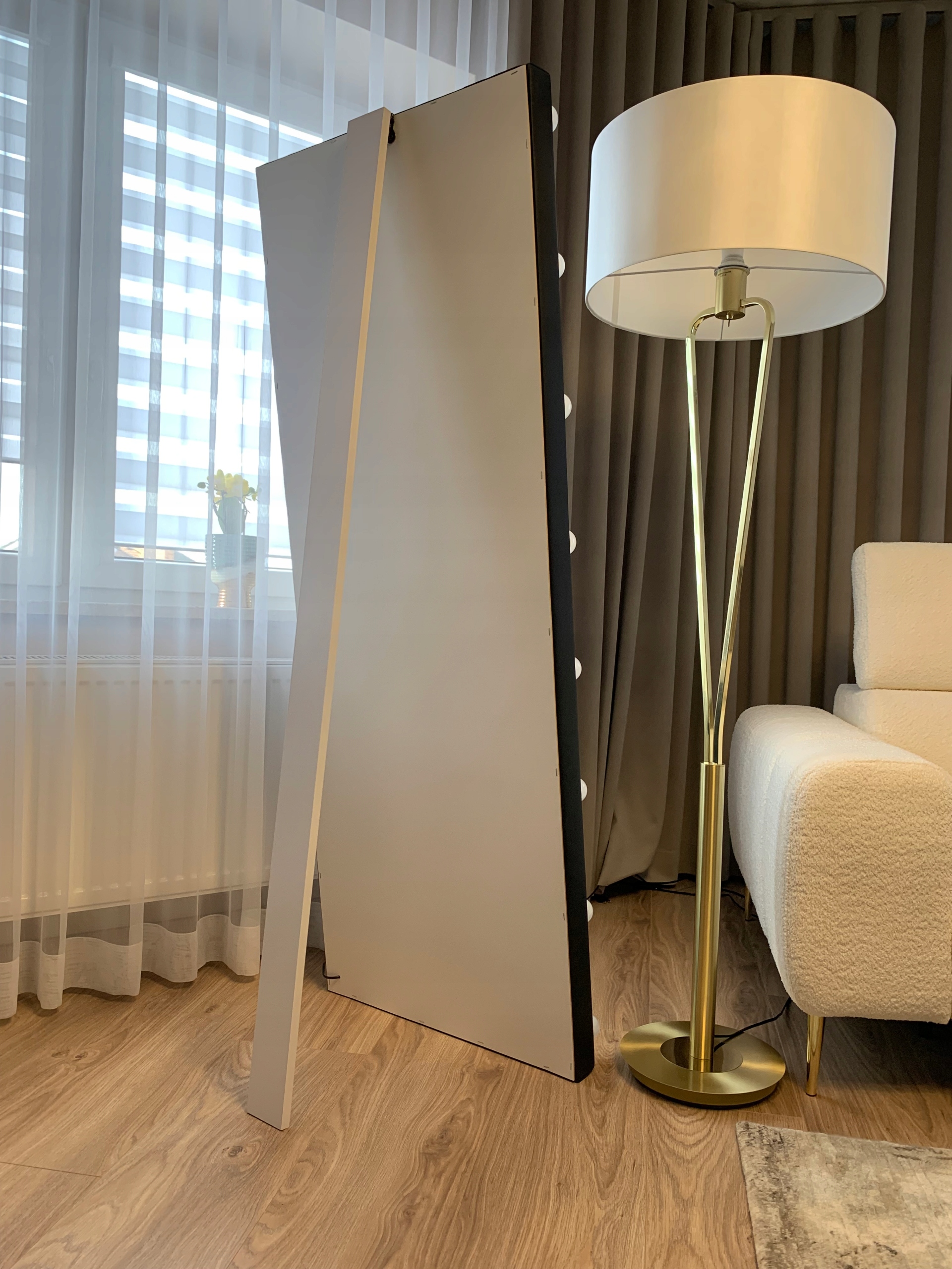 Зеркало имеет съемную ножку на шарнире, благодаря чему мы можем наклонить его под любым углом, когда оно стоит на земле, ножка откручивается, что позволяет в любой момент повесить зеркало на стену. для подвешивания установлены в каждом зеркале.