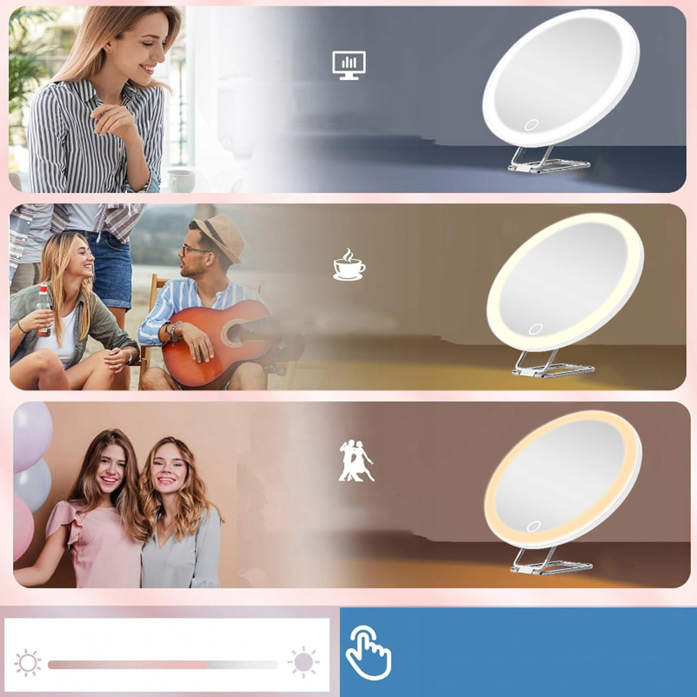 Увеличительное зеркало для макияжа с подсветкой обеспечивает холодный, теплый свет, естественный свет и регулируемую яркость. Короткое нажатие на сенсорный переключатель меняет цвет света, а долгое нажатие регулирует яркость света. Светодиодное увеличительное зеркало также имеет функцию памяти, которая запоминает последнюю настройку яркости.